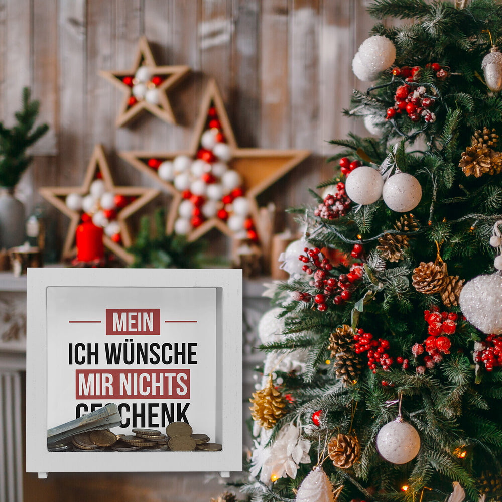 • Die humorvolle Spardose präsentiert sich in einem spielerischen Design auf weißem Hintergrund. Mit schwarzem und rotem Text zieht der auffällige Spruch "ICH WÜNSCHE MIR NICHTS GESCHENK" im Rahmen alle Blicke auf sich. Der zusätzliche "Mein"-Schriftzug oben ergänzt das Ganze. Perfekt für alle, die Sparen mit einem Augenzwinkern verbinden möchten!