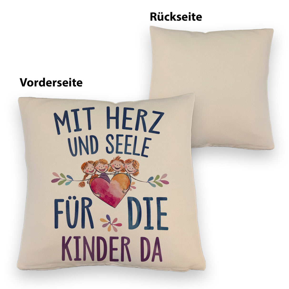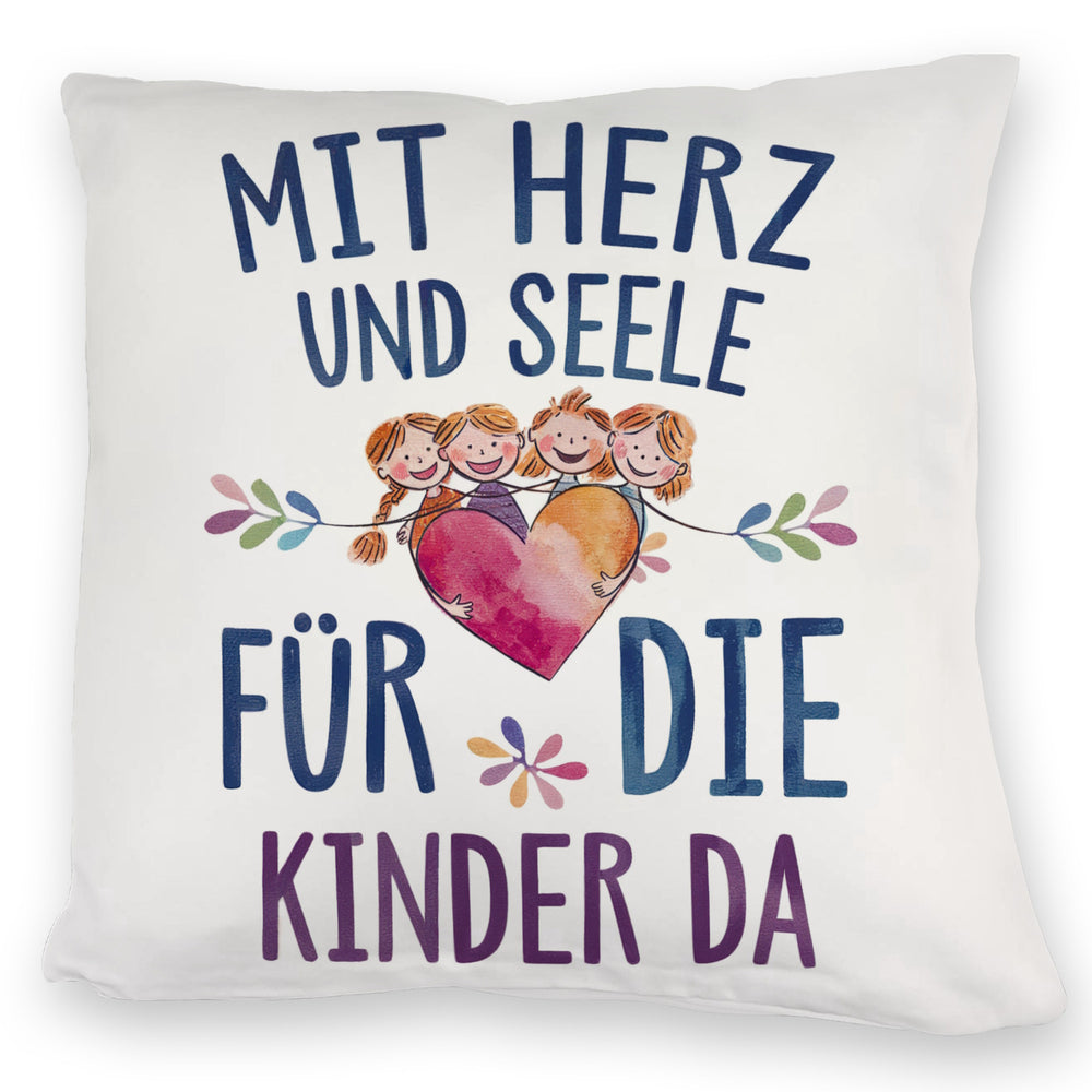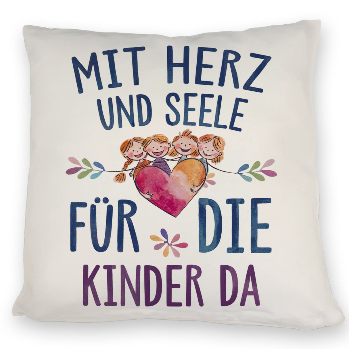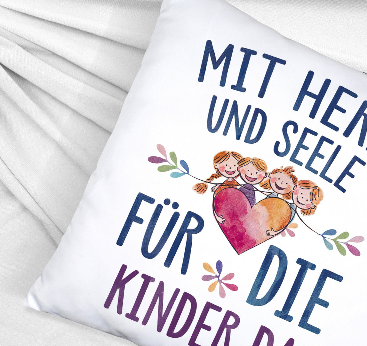 - Dieses lustige Dekokissen zeigt ein großes Herz, das eine fröhliche Gruppe animierter Kinder in Pastellfarben umarmt. Die verspielte Schrift "Mit Herz und Seele für die Kinder da" in Blau und Violett verleiht dem weißen Hintergrund Charme. Bunte Blätter und Blumen ergänzen das Design für ein verspieltes Finish.