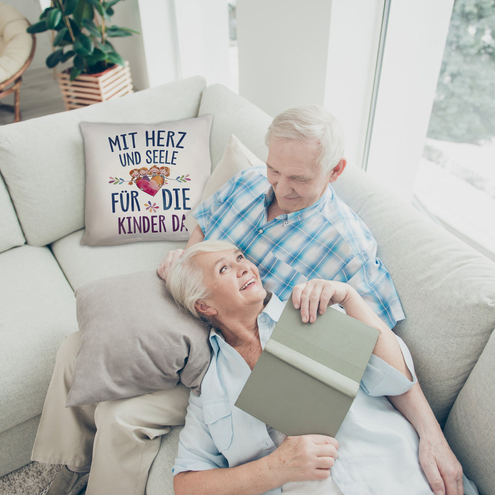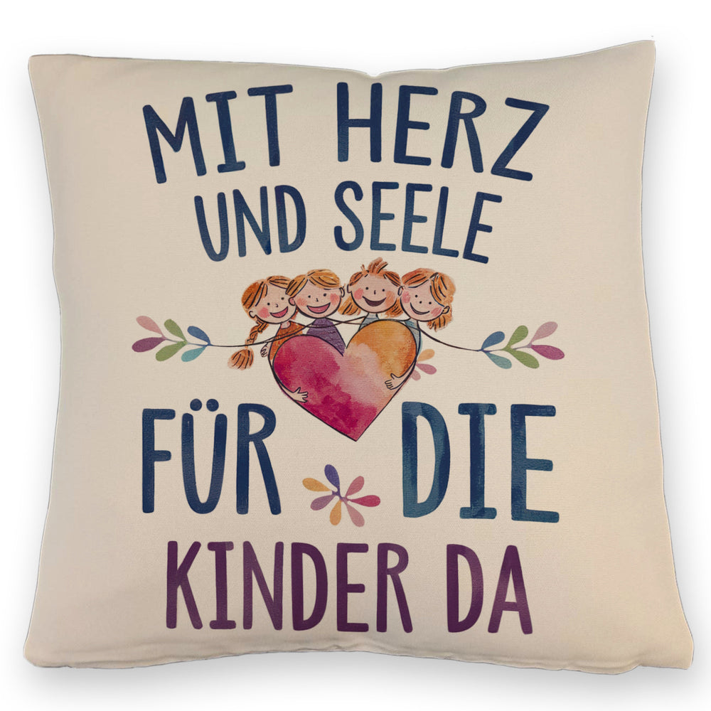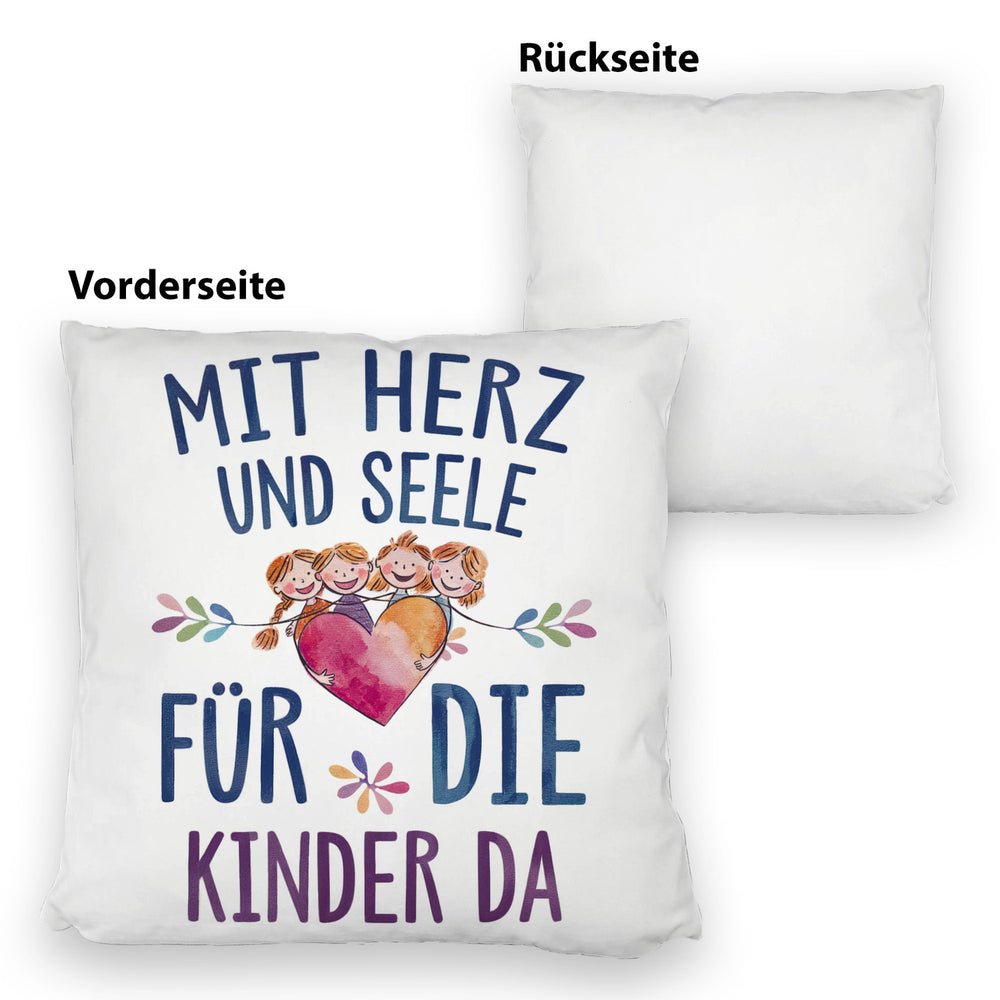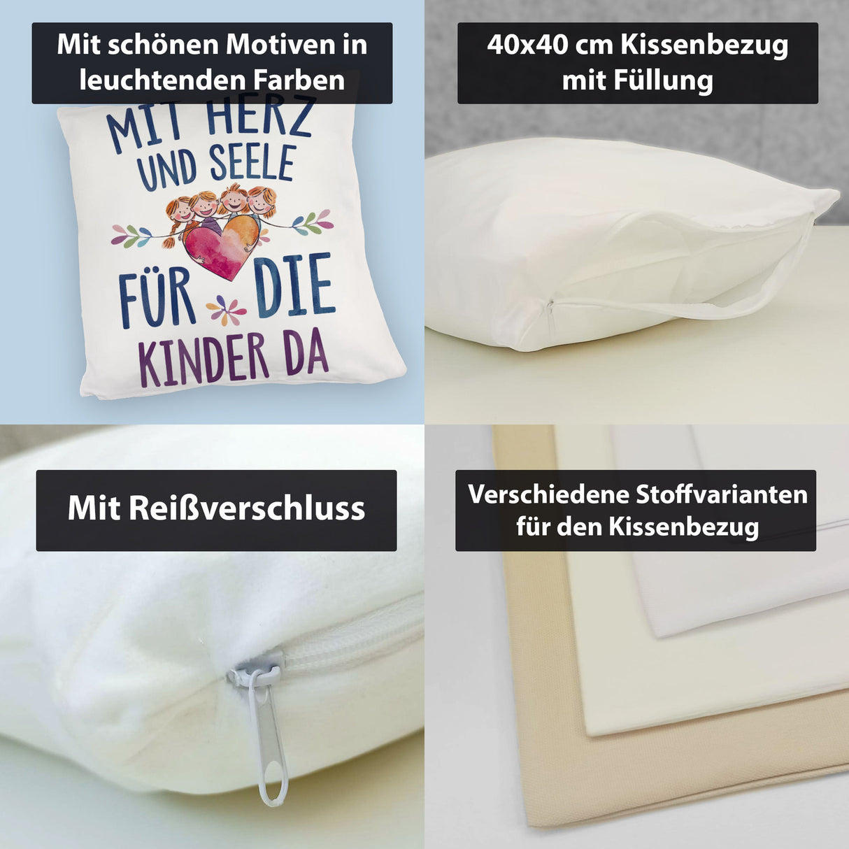 - Dieses lustige Dekokissen zeigt ein großes Herz, das eine fröhliche Gruppe animierter Kinder in Pastellfarben umarmt. Die verspielte Schrift "Mit Herz und Seele für die Kinder da" in Blau und Violett verleiht dem weißen Hintergrund Charme. Bunte Blätter und Blumen ergänzen das Design für ein verspieltes Finish.