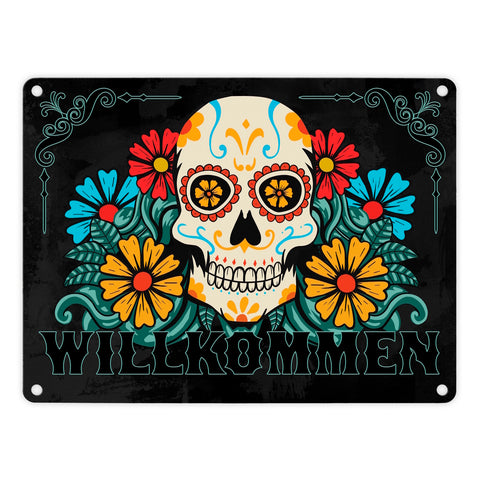 Willkommen Metallschild mit Totenkopf und Blumenmotiv