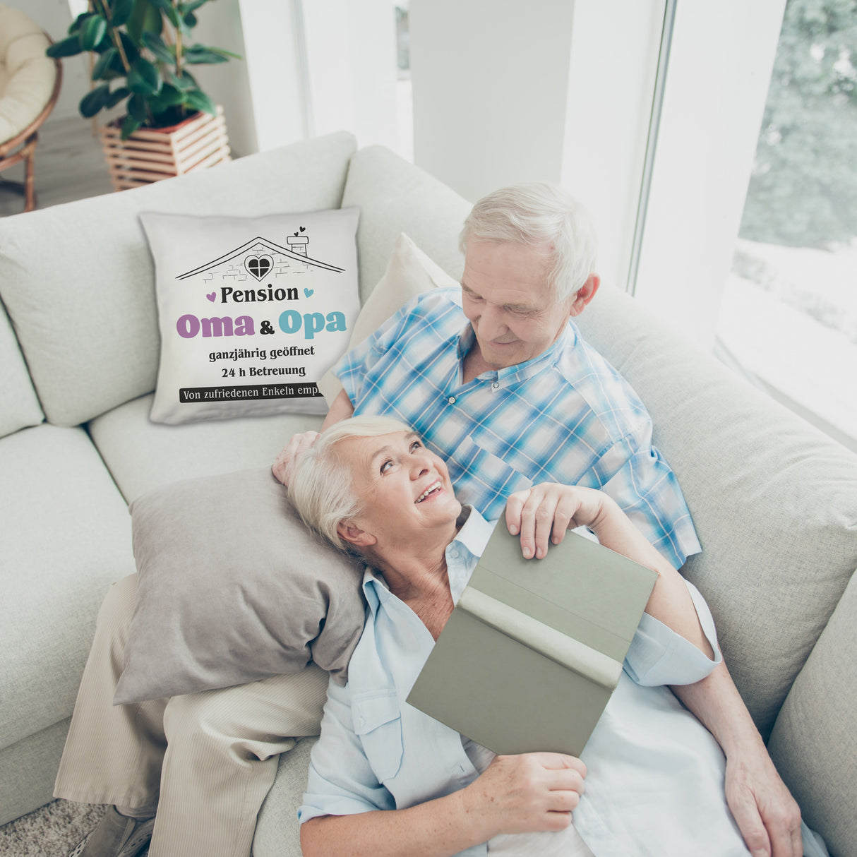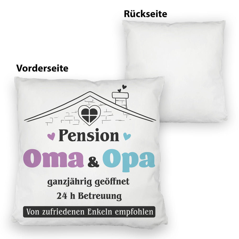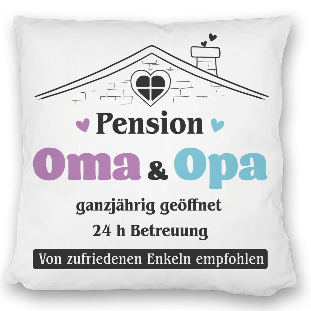 Pension Oma & Opa Kissen mit Spruch Von zufriedenen Enkeln empfohlen