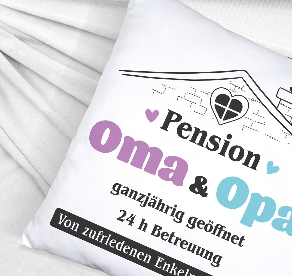 - Dieses ausgefallene Kissen mit dem charmanten Pension Oma & Opa Motiv ist ein echter Hingucker. Es zeigt ein niedliches Häuserdach mit herzförmigem Fenster, aus dem kleine Herzen aufsteigen. Dieses Kissen ist ein Must-Have für alle, die ihren Großeltern eine Freude machen wollen und ihre Wertschätzung zeigen möchten.