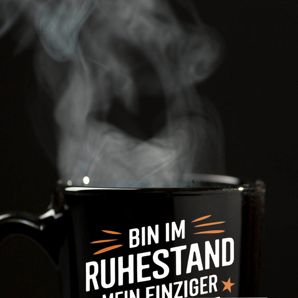 Ein schwarzer Kaffeebecher mit einem humorvollen Spruch, der perfekt den Übergang in den Ruhestand feiert. Weiße Schriftzüge und dekorative orangefarbene Elemente wie Sterne und ein Band verleihen dem Design Charme. Der lustige Spruch "BIN IM RUHESTAN Hinweise: Fassungsvermögen: ca. 300ml