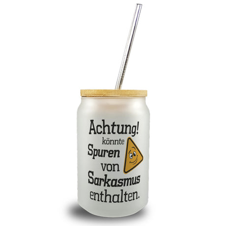 Sarkasmus Warnung Trinkglas mit Bambusdeckel Achtung kann Spuren enthalten