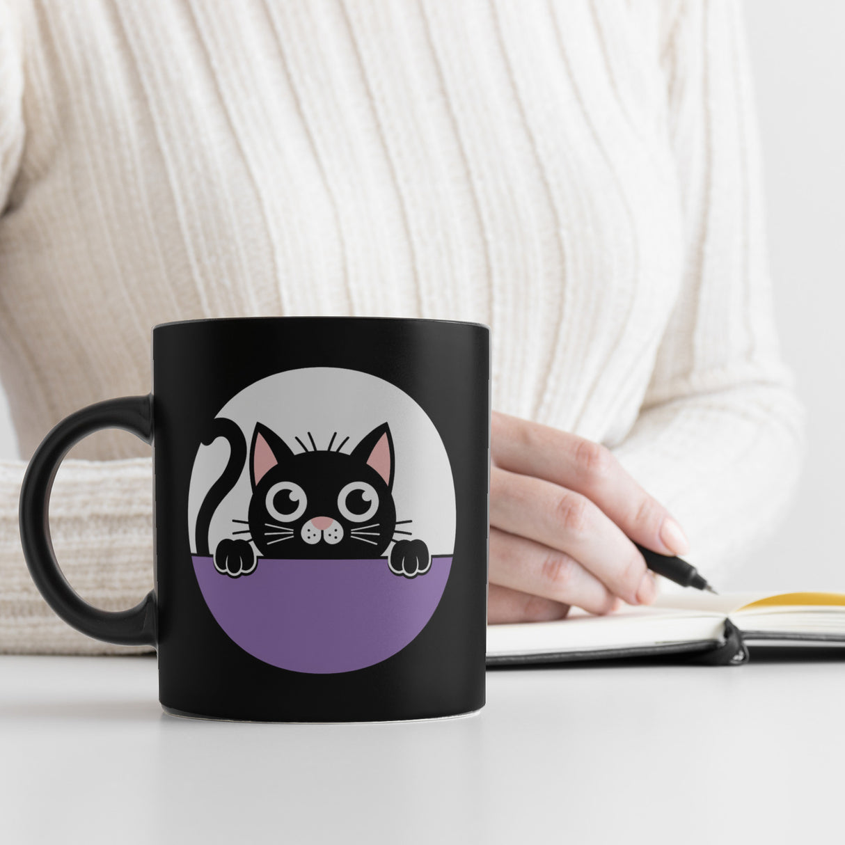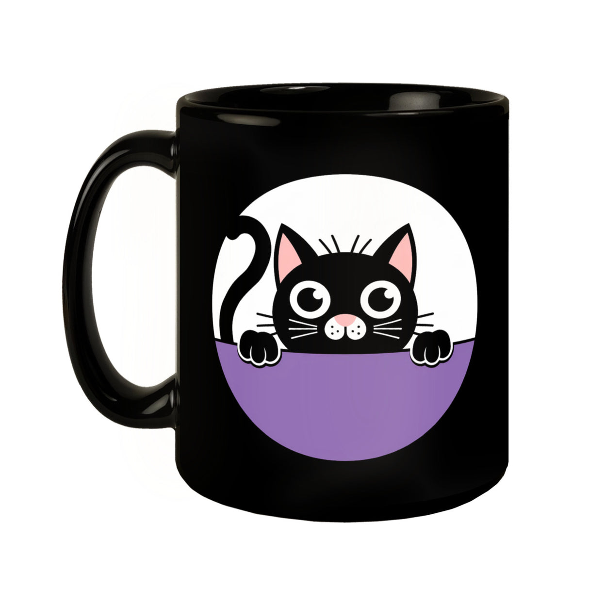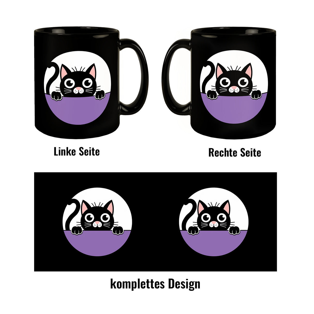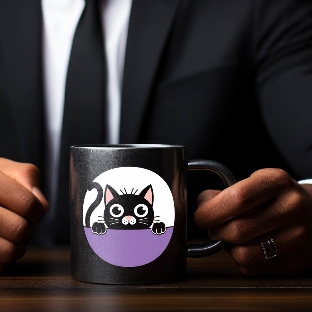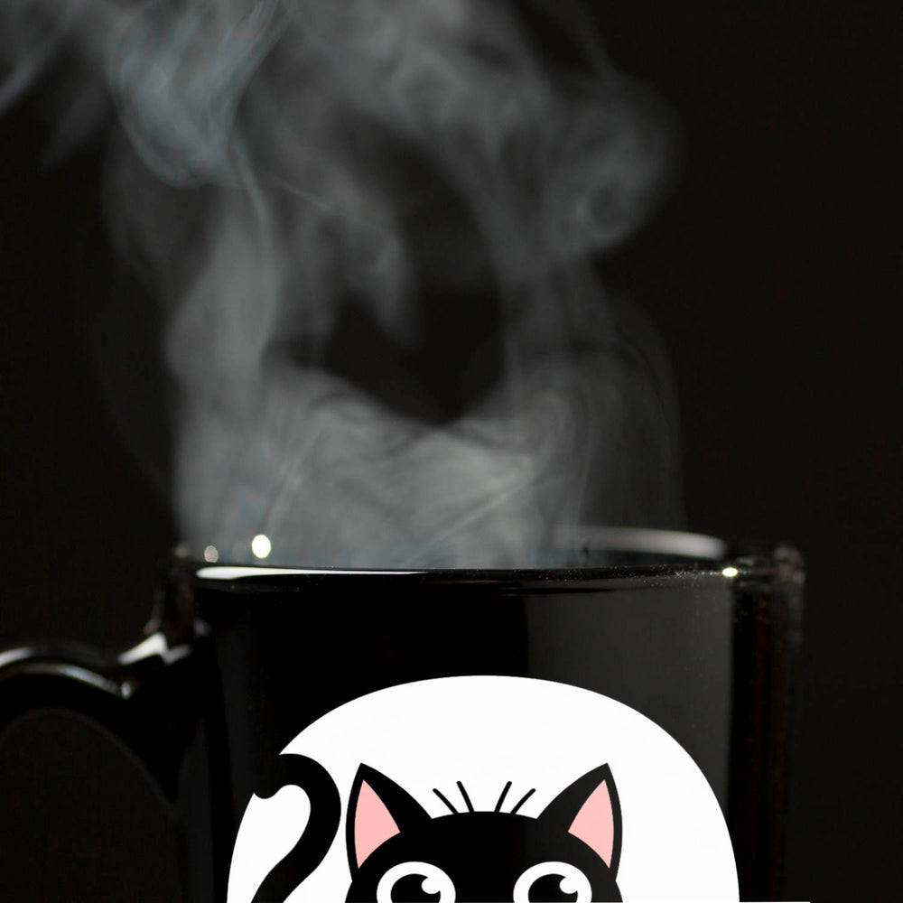 - Verlieben Sie sich in das charmante Design unserer schwarzen Katzentasse! Der schwarze Hintergrund kontrastiert perfekt mit der weißen Umrisszeichnung der Katze, die mit großen, runden Augen und einer rosa Nase entzückt. Der gekringelte Schwanz und die Pfoten verleihen der Tasse einen verspielten Touch.