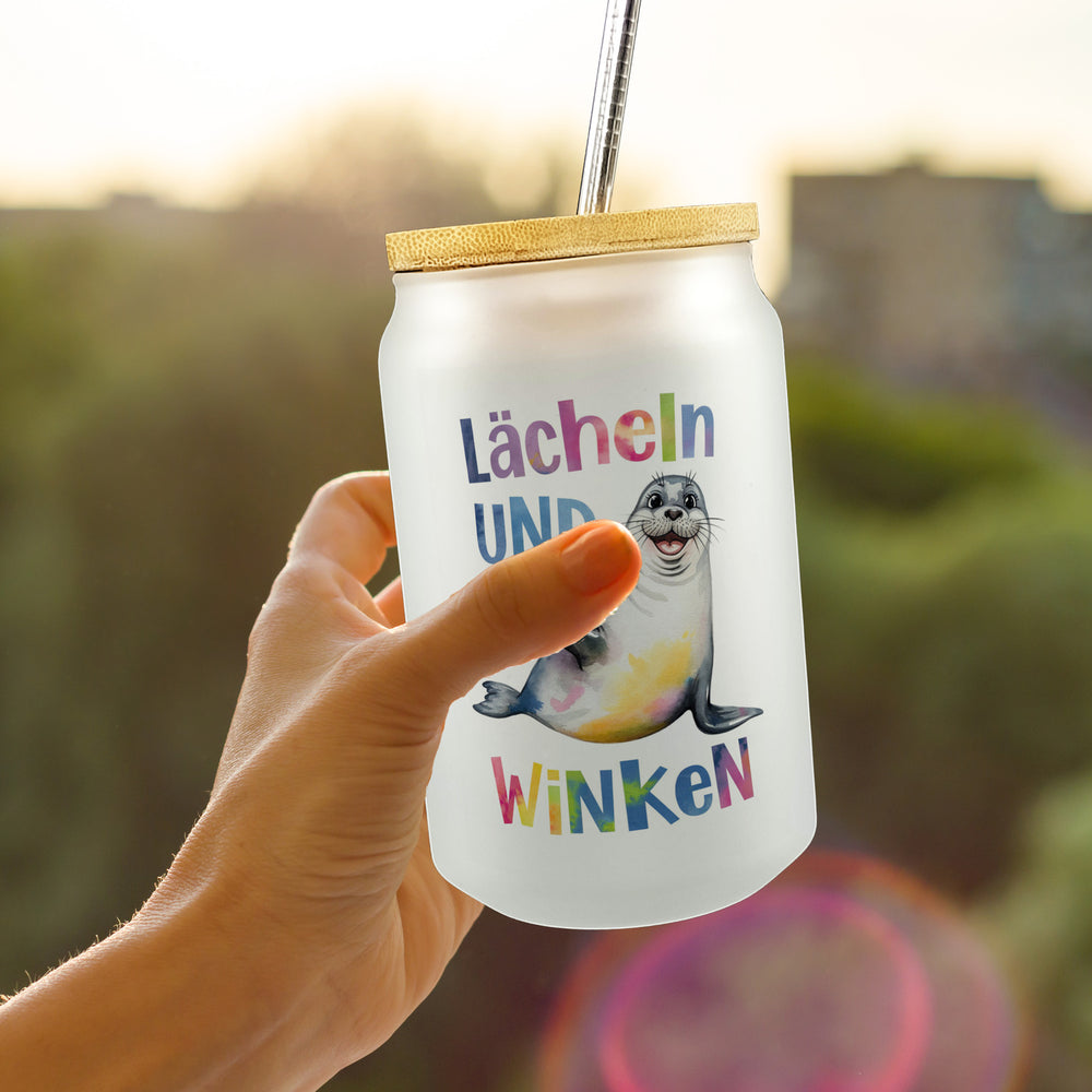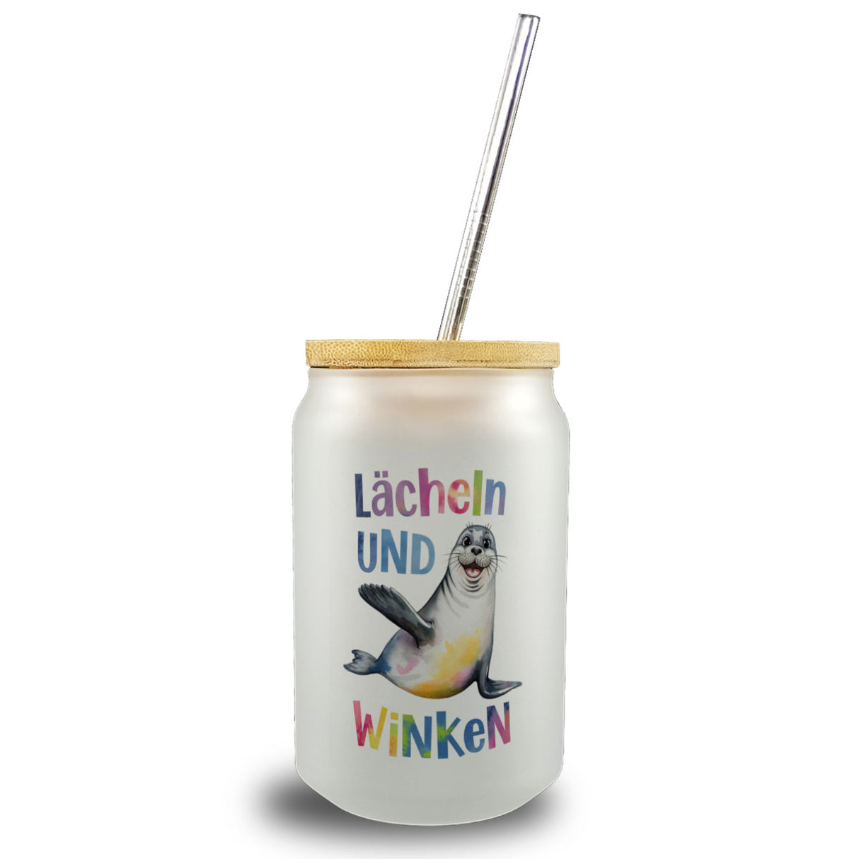 • 1x Seehund Lächeln und Winken Trinkglas mit Bambusdeckel mit Bambusdeckel oder Henkel