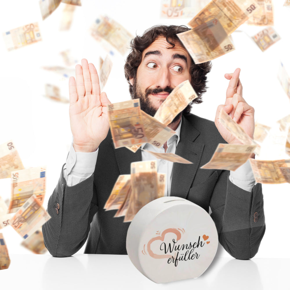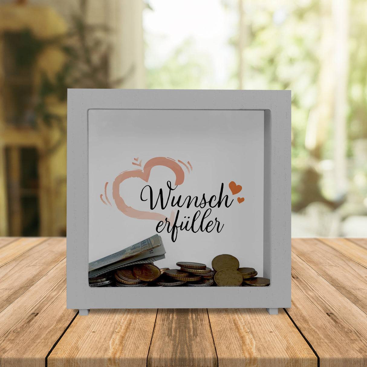Mit unserer Spardose aus Keramik mit Herzmotiv und Text - Wunscherfüller mit Herzchen, schenkst du jemandem ein Stückchen Glück. Diese Dose symbolisiert Deine Liebe, denn sie ist ein ganz besonderer Wunsch-Erfüller! Mit ihrem schönen Design und dem Text, der Deine Gefühle widerspiegelt, ist sie ein perfektes Geschenk für jeden Anlass. Ob als Geschenk zur Hochzeit, Muttertag oder Weihnachten – diese Spardose ist ein Geschenk voller Hoffnung und Zuversicht. Sie ist in drei verschiedenen Varianten erhältlich: als schlichte Holzspardose, als hochwertige ovale Keramik-Version oder als exklusive Rahmen-Variante aus Holz mit Sichtfenster. Jede Spardose wird in unserer Manufaktur in Deutschland sorgfältig in Handarbeit hergestellt und bietet so qualitativ hochwertigen Druck und eine lange Lebensdauer. Mache deinen Liebsten Freude und überrasche sie mit dieser Spardose - beginne die Erfüllung ihrer Träume!