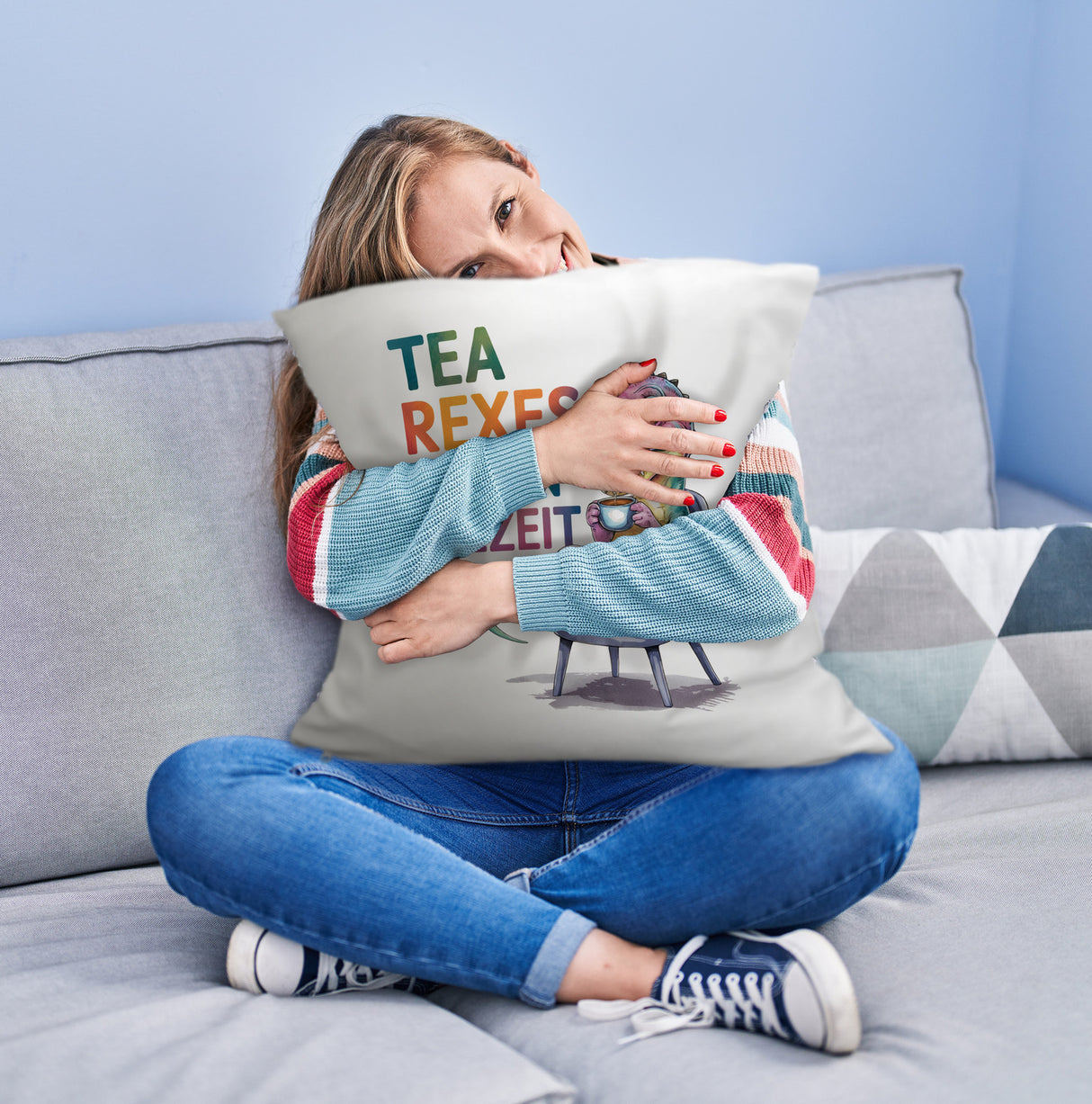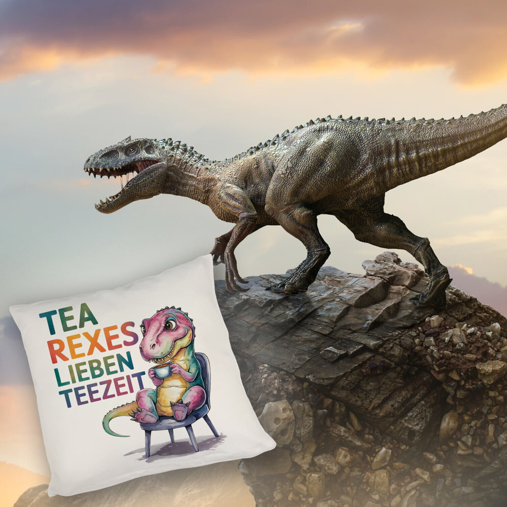 - Dieses lustige Kissen zeigt einen niedlichen T-Rex, der genüsslich Tee schlürft! Der verspielte Dinosaurier sitzt auf einem Stuhl, hält eine Tasse in der Hand und streckt schelmisch die Zunge heraus. Mit einem farbenfrohen Teekannenmotiv und dem Schriftzug "TEA REXES LIEBEN TEEZEIT" zieht es alle Blicke auf sich. Ein echter Hingucker!