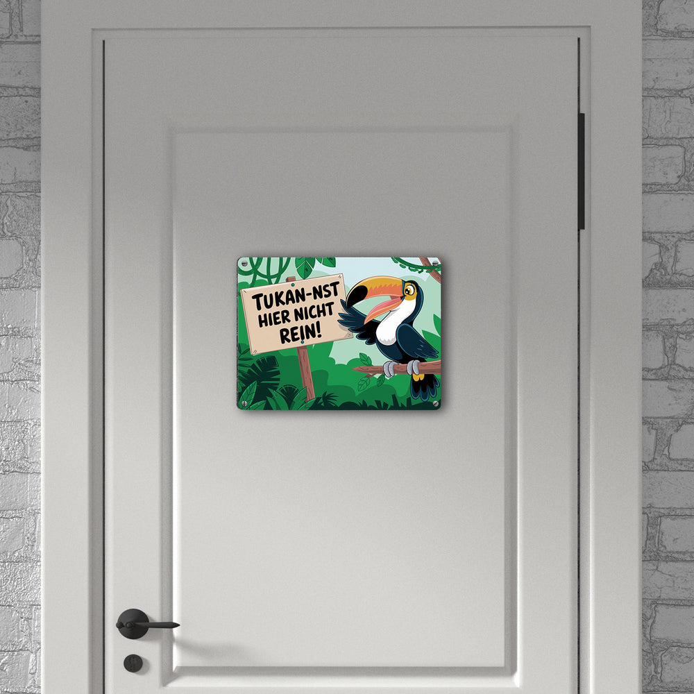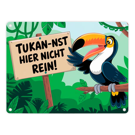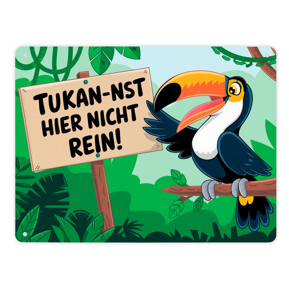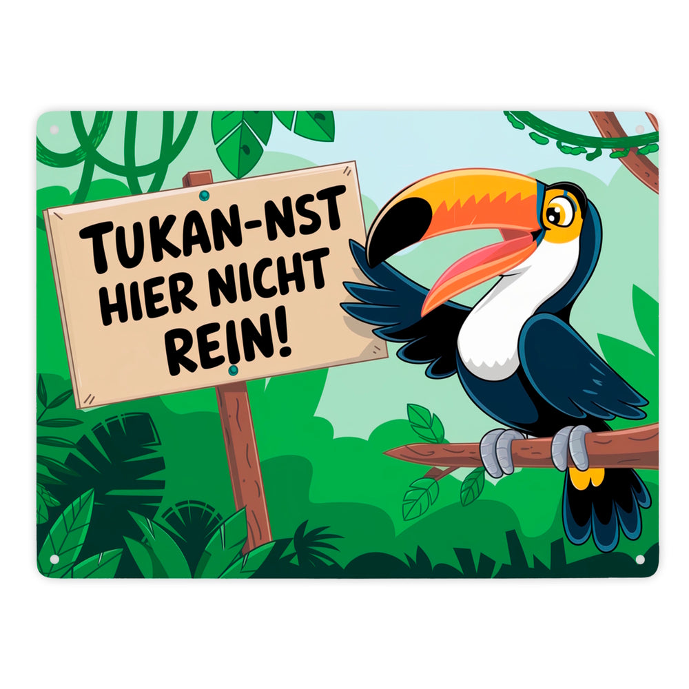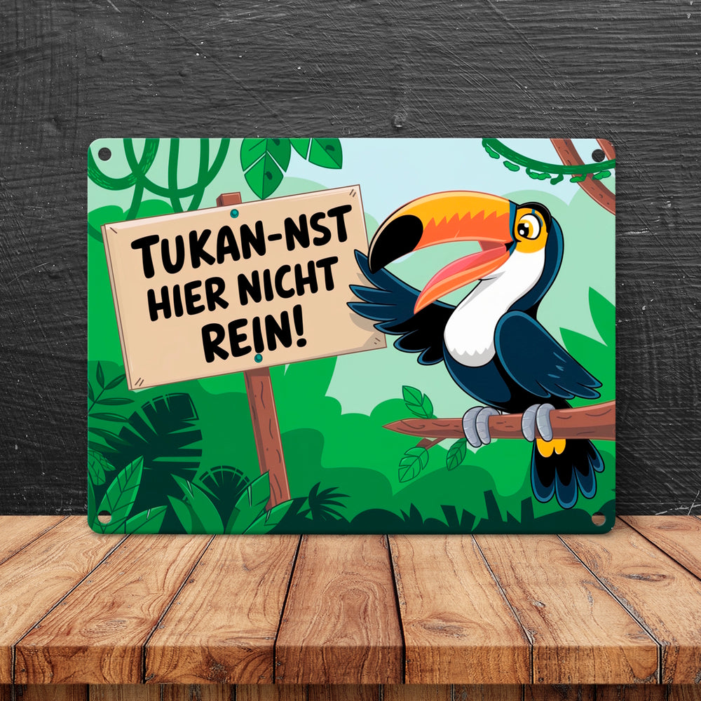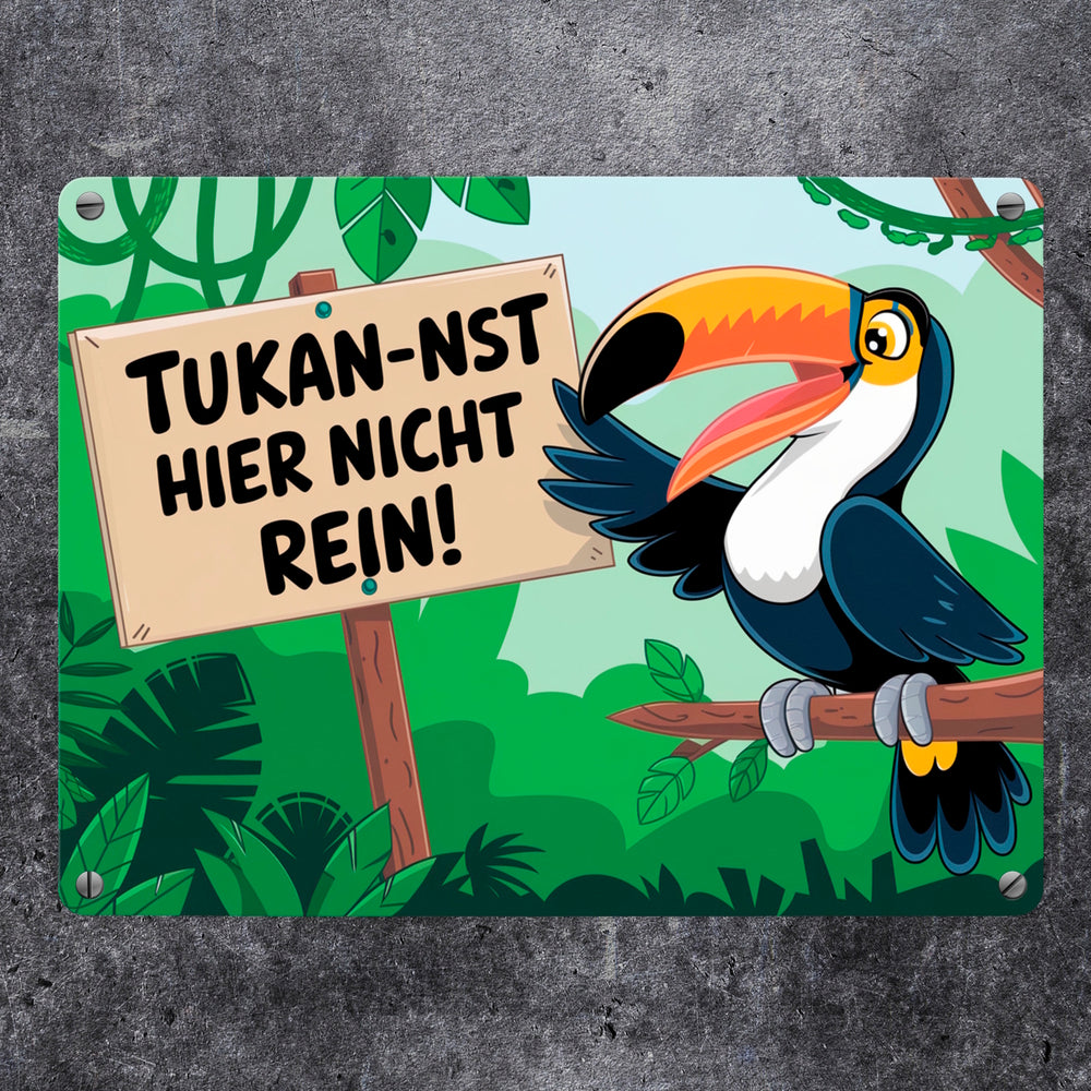 - Dieses humorvolle Metallschild zeigt einen lachenden Tukan, der auf einem Ast im üppigen Dschungel sitzt. Der kecke Vogel hält ein Schild mit dem frechen Spruch "Tukan-nst hier nicht rein!". Drumherum ranken grüne Pflanzen und Lianen – ein echter Hingucker und Lacher zugleich!