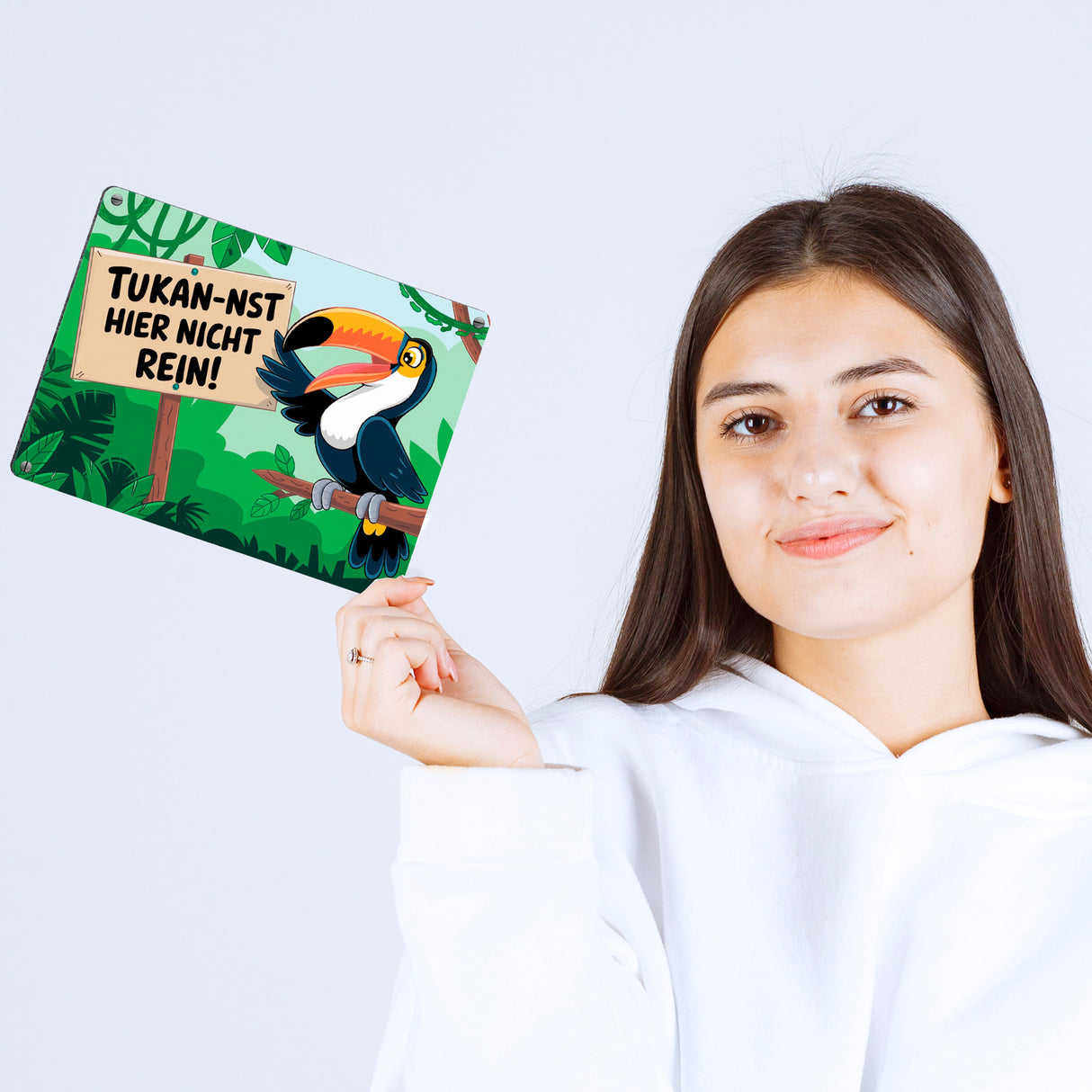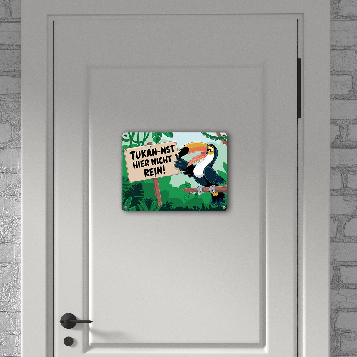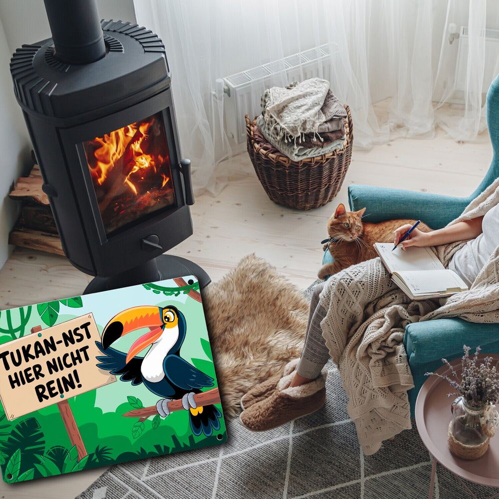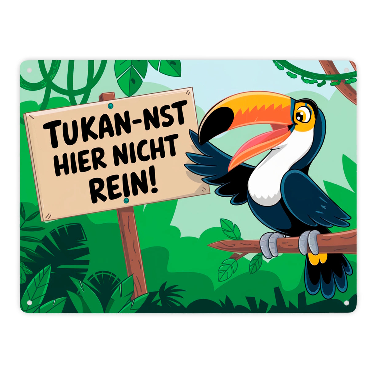 - Dieses humorvolle Metallschild zeigt einen lachenden Tukan, der auf einem Ast im üppigen Dschungel sitzt. Der kecke Vogel hält ein Schild mit dem frechen Spruch "Tukan-nst hier nicht rein!". Drumherum ranken grüne Pflanzen und Lianen – ein echter Hingucker und Lacher zugleich!