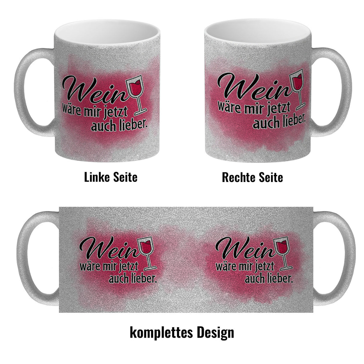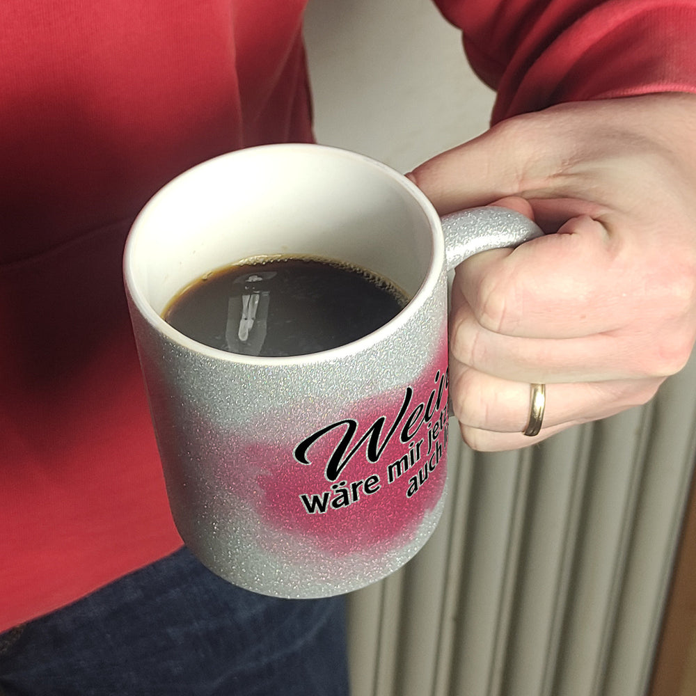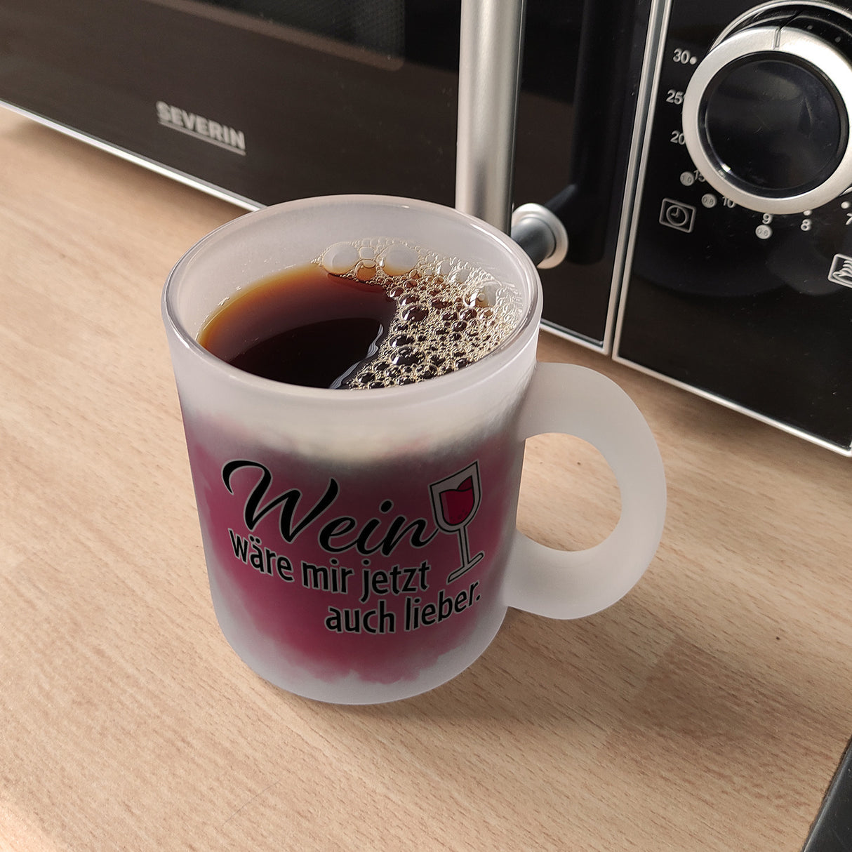 Verleihen Sie Ihrer Kaffee- und Teepause ein neues, schönes Gefühl mit dem Wein wäre mir jetzt auch lieber Kaffeebecher. Dieser Becher ist die perfekte Wahl für alle Weinfans, die nicht nur Tee oder Kaffee trinken möchten. Erhältlich in verschiedenen Varianten, als weiße Standardtasse, mit farbigem Henkel und Innenseite, als edle Glastasse oder in der exklusiven Silberedition mit Glitzereffekt. Jeder Becher wird mit Sorgfalt in Handarbeit hergestellt und hat ein edles Weinglas Motiv sowie weinrote Farben. Egal ob als Geschenk für Kollegen oder als kleine Belohnung für sich selbst - dieser Kaffeebecher ist eine tolle Ergänzung für jede Arbeitspause! Genießen Sie Ihren Lieblingswein auf stilvolle Weise und lassen Sie sich daran erinnern: „Wein wär mir jetzt auch lieber“!