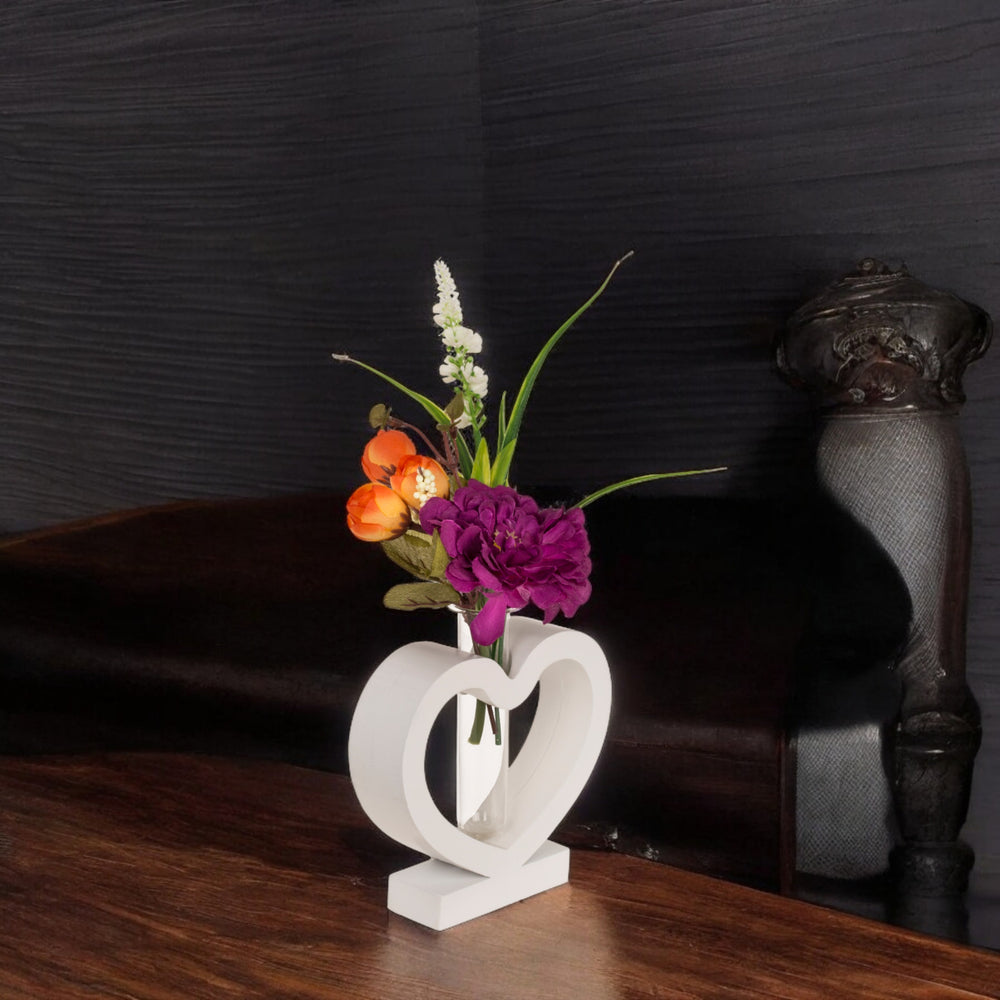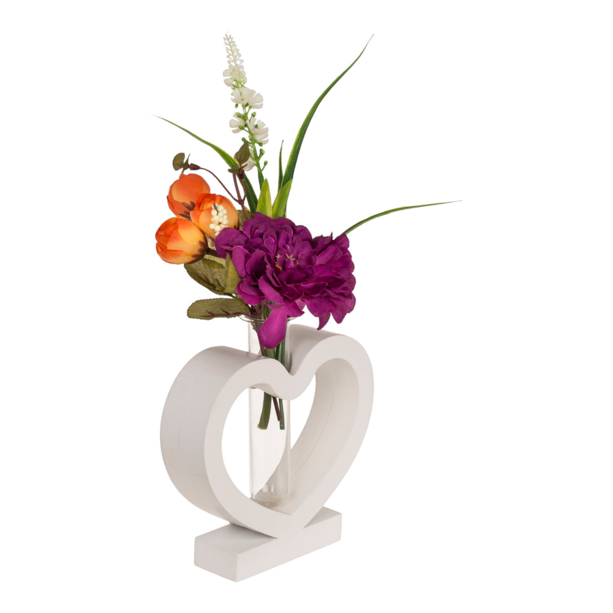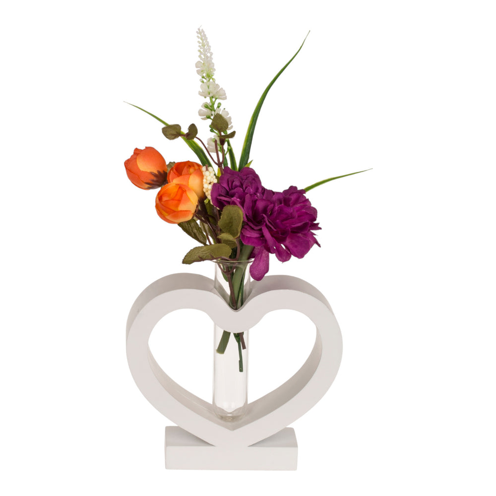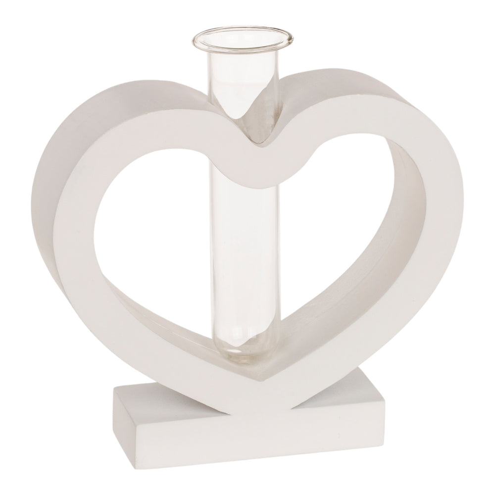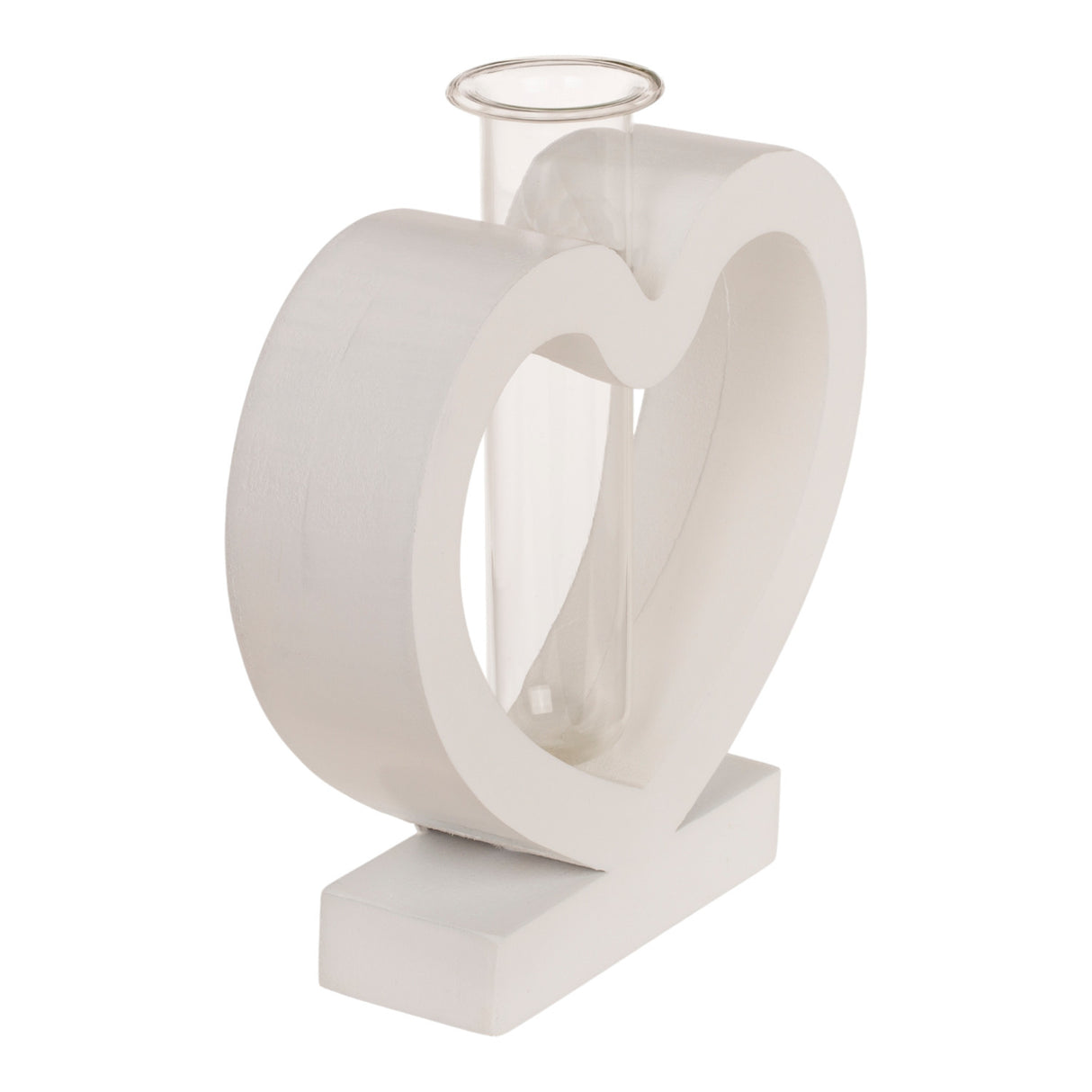 - Dieses charmante Produkt kombiniert ein herzförmiges Holzdesign, stilvoll in Weiß lackiert, mit einem Glasröhrchen als Vase. Dieses bietet Platz für eine zierliche Blume oder kleine Blumenarrangements. Die Herzform steht für Liebe und ist das i-Tüpfelchen Ihrer Tischgestaltungen bei Hochzeitsfeiern oder Valentinstagsdekorationen.
