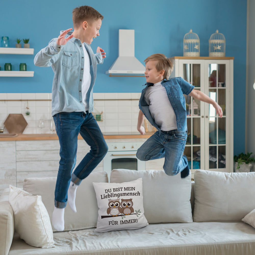 - Dieses Dekokissen zeigt zwei niedliche Eulen mit großen, runden Augen, die in einem verspielten Cartoon-Stil auf einem Ast sitzen. Der Hintergrund ist schlicht weiß, wodurch die typografische Botschaft „Du bist mein Lieblingsmensch für immer!“ in großen Buchstaben besonders hervorsticht. Ein charmantes Accessoire für jedes Zuhause!