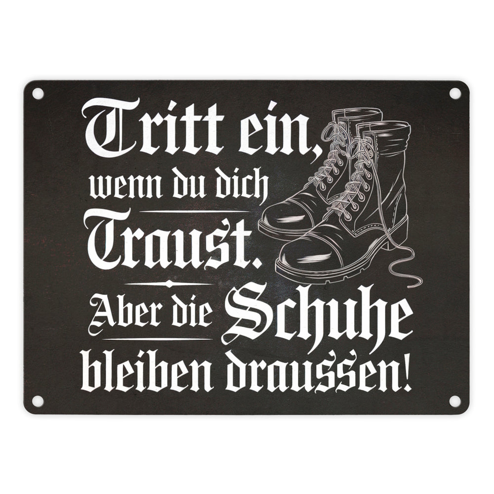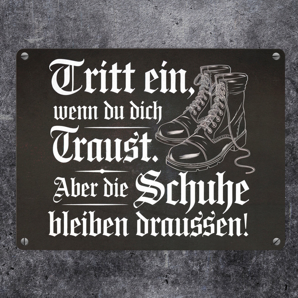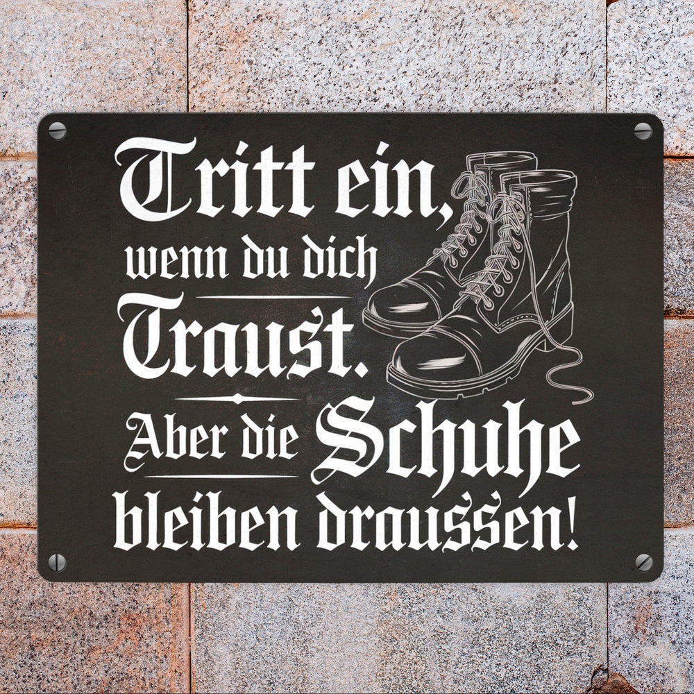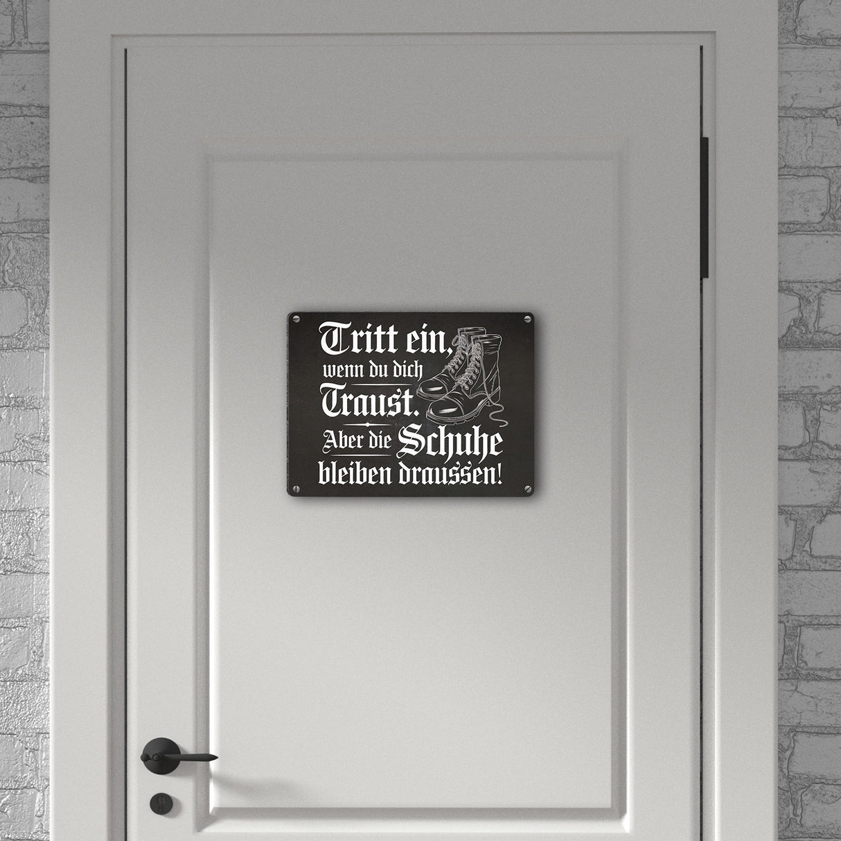 Tritt ein wenn du dich Traust Metallschild in 15x20 cm - Schuhe bleiben draussen