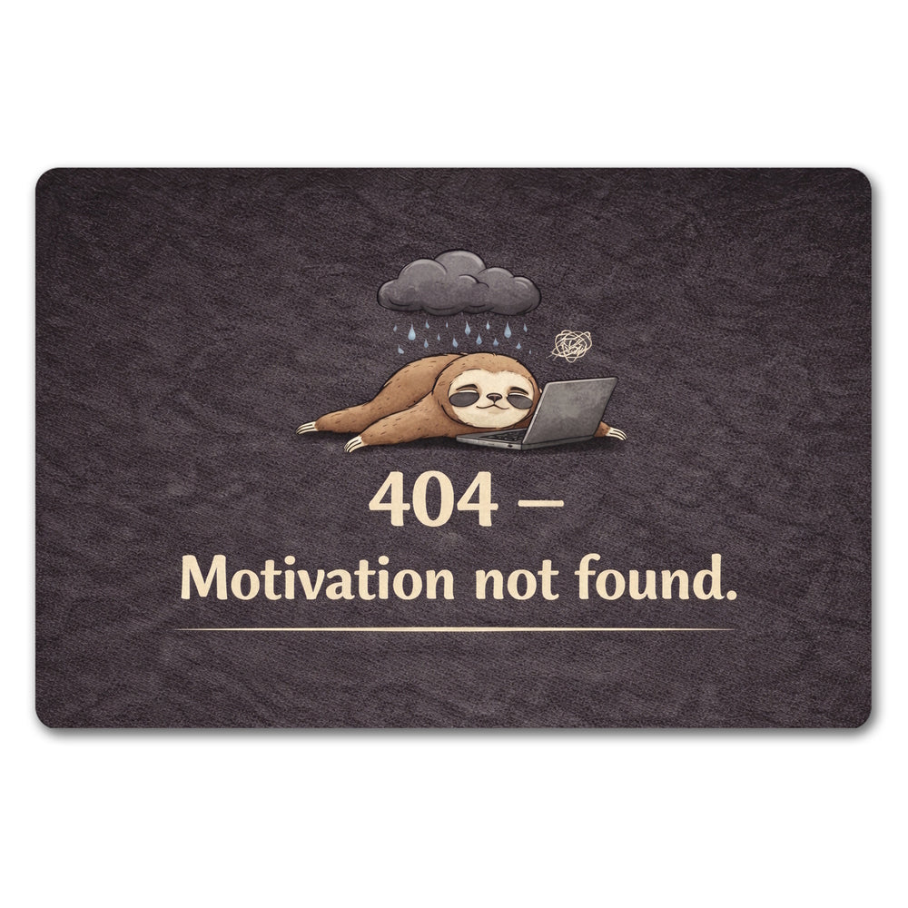 • Diese lustige Fußmatte zeigt ein niedliches Faultier mit einem schläfrigen Gesichtsausdruck und einem Laptop. Im Hintergrund prasseln kleine Regentropfen von einer grauen Wolke. Auf dem dunkelgrauen, texturierten Untergrund sticht der Spruch "404 Motivation not found" in großen beigen Zahlen hervor und sorgt für ein schmunzelndes Willkommen.