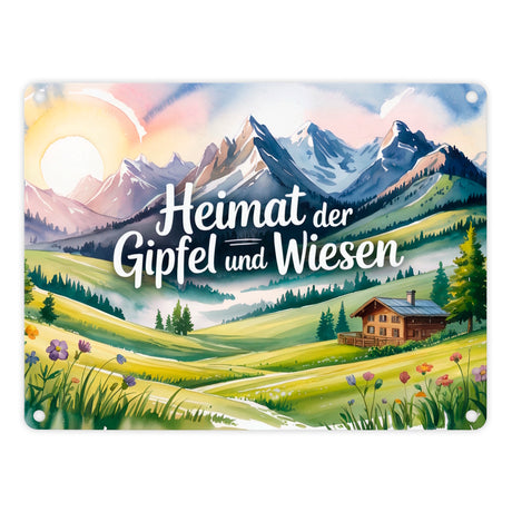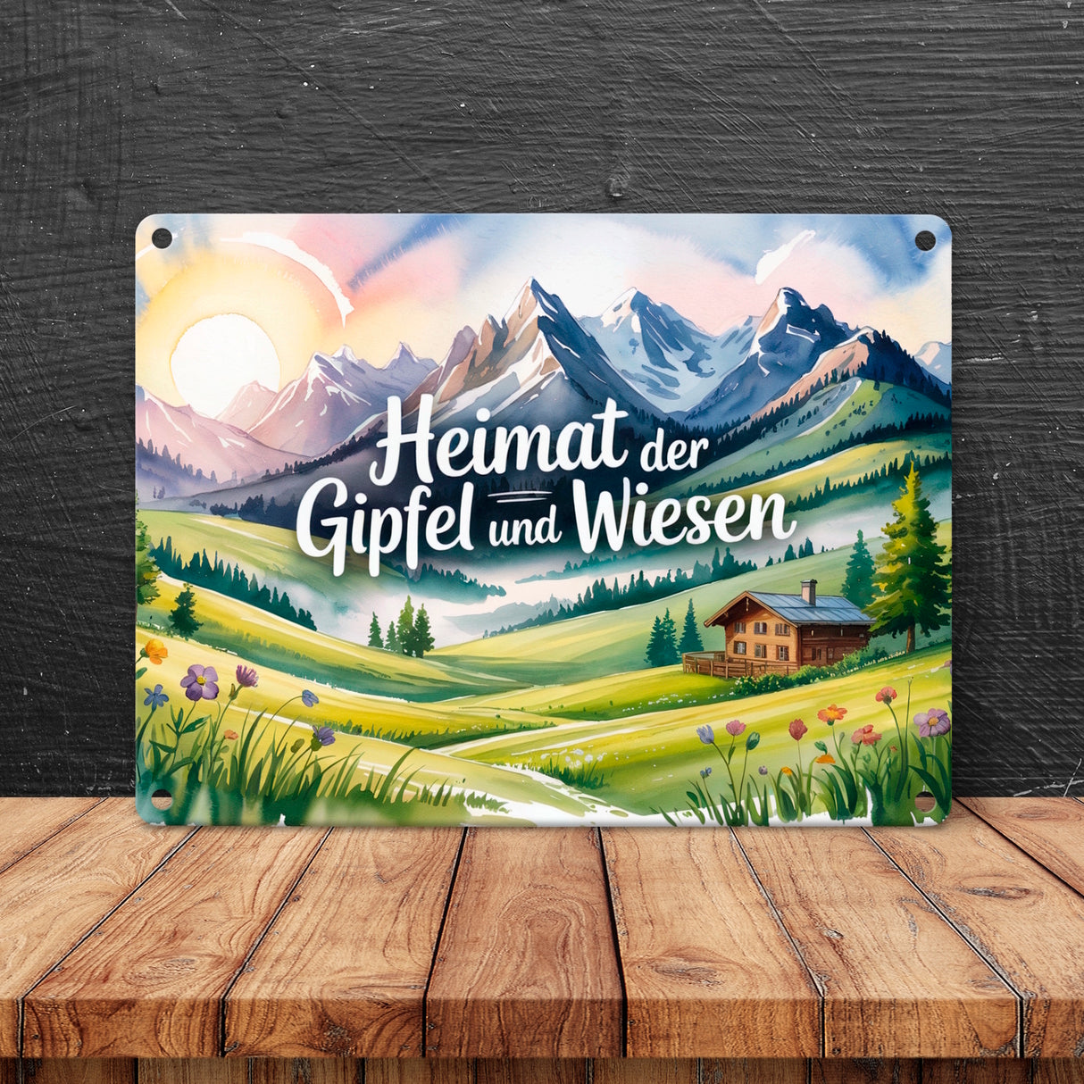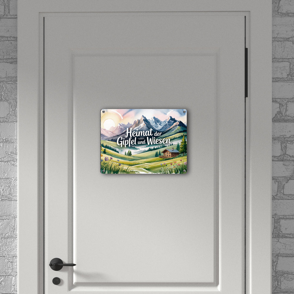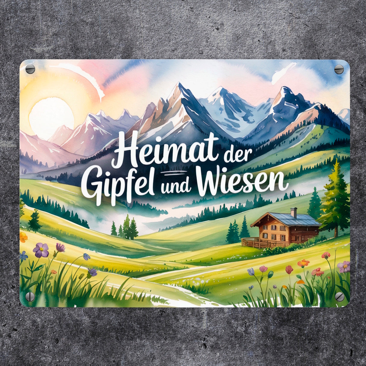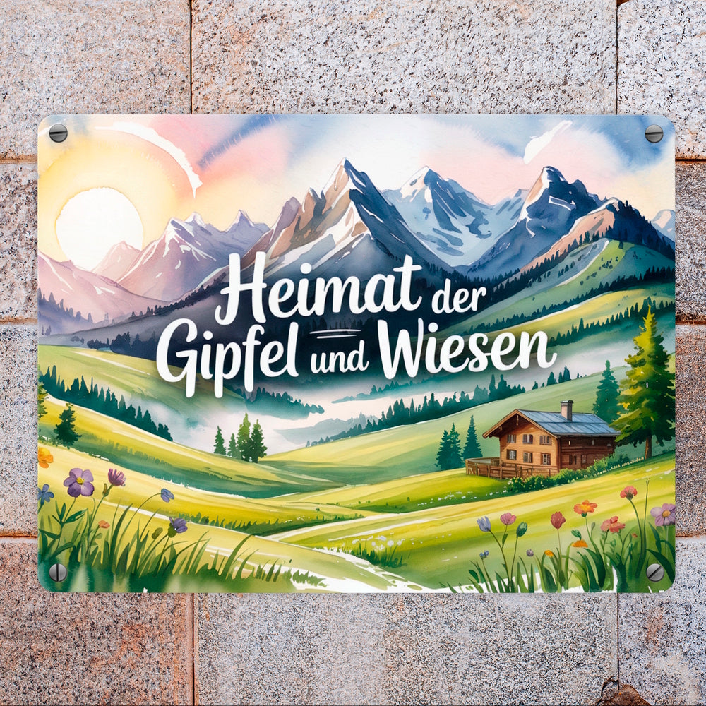 • Das Metallschild "Heimat der Gipfel" verkörpert die beeindruckende Schönheit der Allgäuer Berglandschaft. Auf einer Aquarell-Illustration erstrahlen sanft geschwungene Wiesen, majestätische, schneebedeckte Gipfel und ein idyllisches bayerisches Chalet. Die harmonische Mischung aus Wildblumen und weichem Sonnenlicht bietet einen bezaubernden Panoramablick.