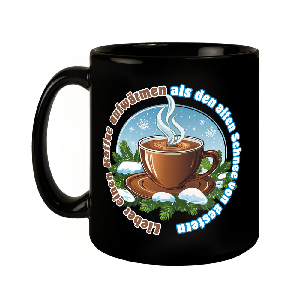 - Diese schwarze Kaffeetasse beeindruckt mit ihrem originellen Design: Eine dampfende Kaffeetasse auf schneebedeckten Tannenzweigen, die Behaglichkeit und Winterzauber vereint. Der humorvolle Spruch "Lieber einen Kaffee aufwärmen als den alten Schnee von gestern" bringt ein Lächeln auf die Lippen jedes Kaffeeliebhabers.