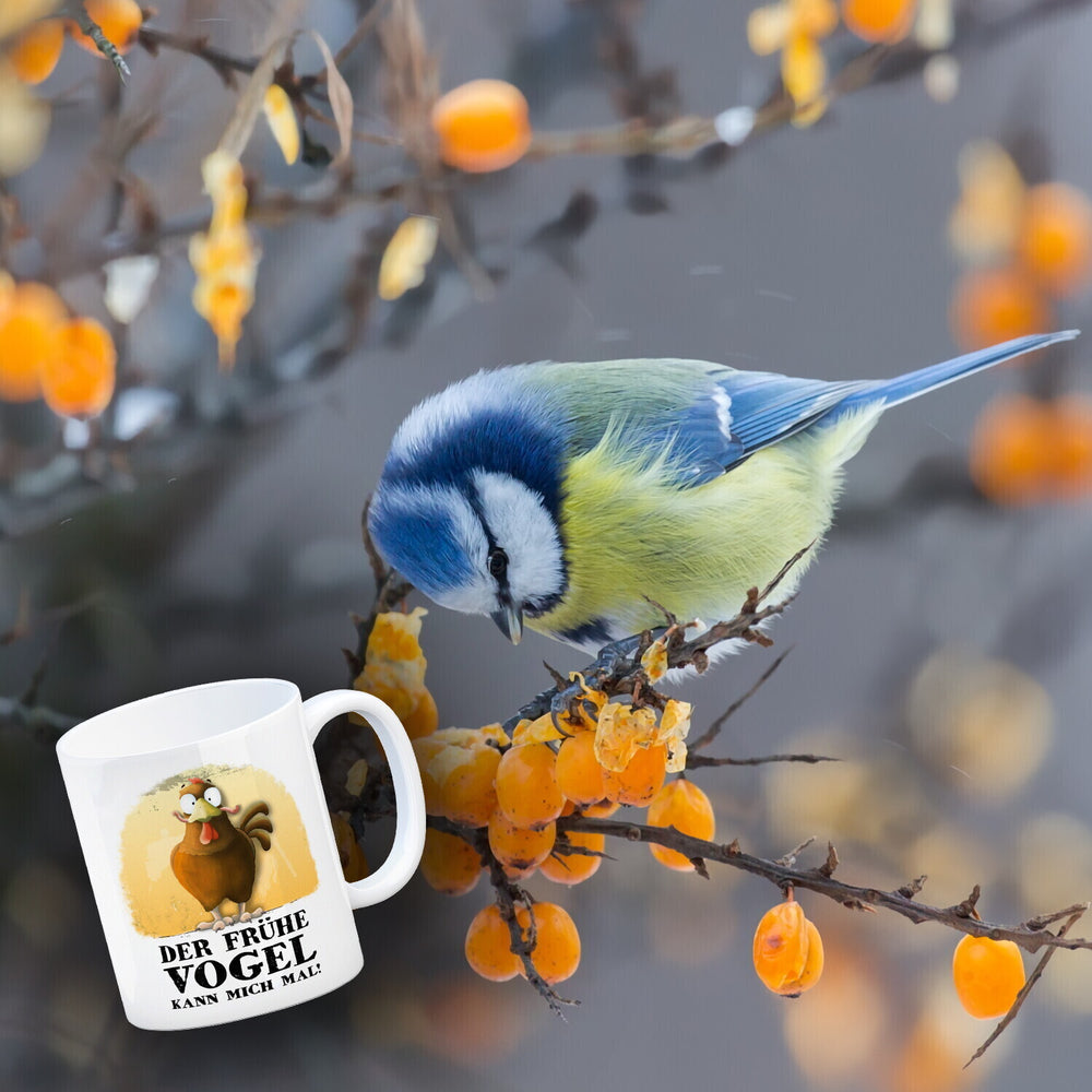 Kaffeebecher mit Bild und Spruch Der frühe Vogel kann mich mal!