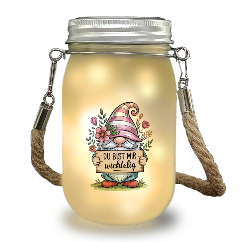 - Das Solarlicht zeigt einen fröhlichen Wichtel mit gestreifter, pink-weißer Mütze und rosigen Wangen. Sein hellblaues Outfit wird durch rote Stiefel ergänzt. In seinen Händen hält er ein Holzschild mit der Aufschrift "DU BIST MIR wichtig". Blumen und Blätter umrahmen sein Gesicht, alles in einem charmanten, volkstümlichen Stil gehalten.