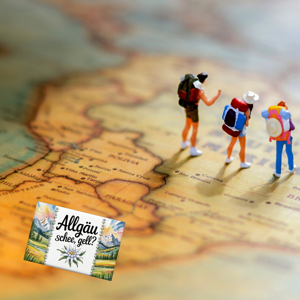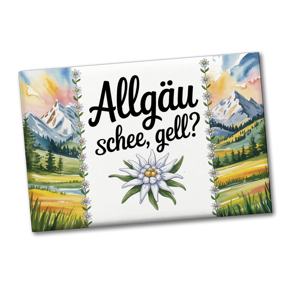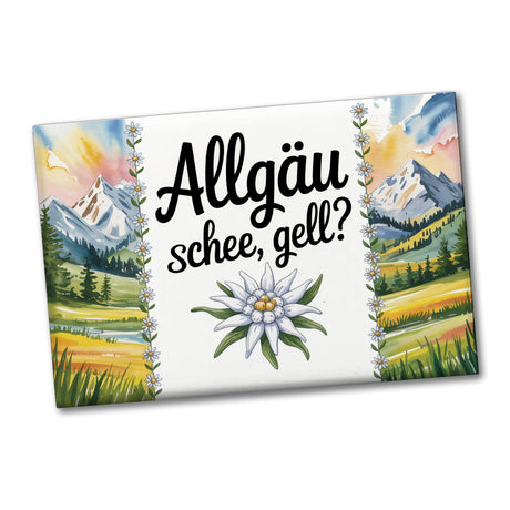 - Der Edelweiß Allgäu Souvenir-Magnet entführt dich in die malerische Bergwelt des Allgäus. Das eckige Design vereint handgezeichnete Schriftzüge mit einer Aquarellillustration der Edelweißblume. Umrahmt von schneebedeckten Bergen und grünen Wiesen, verbreitet der Magnet mit seinem Spruch "Allgäu und schee, gell?" pure Lebensfreude.