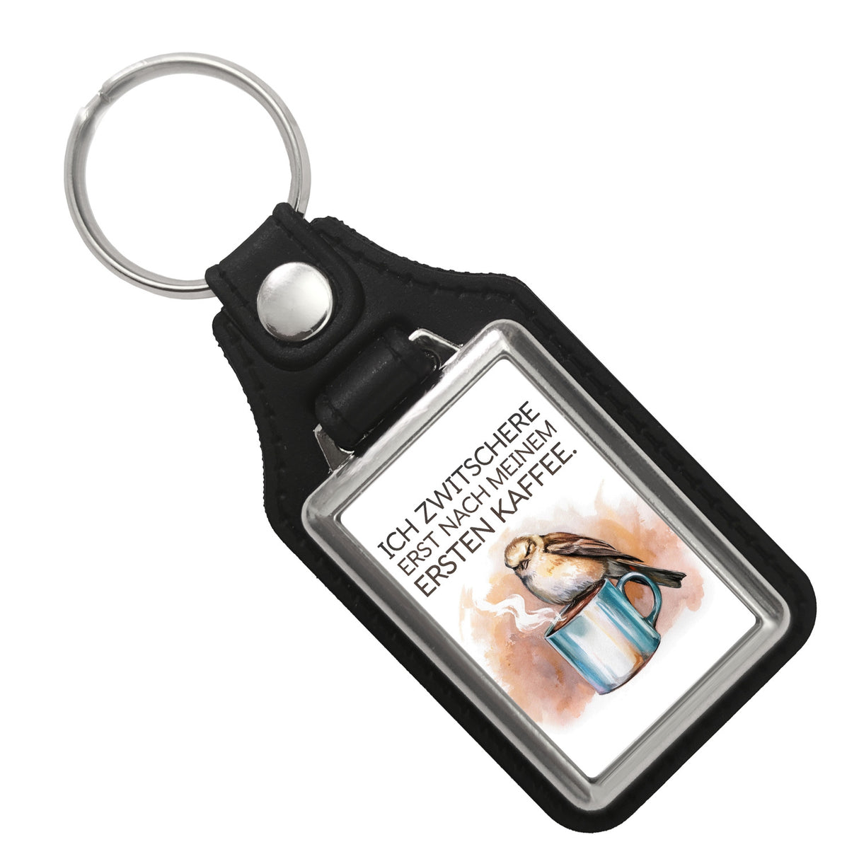 - Der Schlüsselanhänger zeigt ein niedliches Aquarell-Design mit einem verschlafenen Spatz, der auf einer dampfenden blauen Kaffeetasse sitzt. Der Spruch "Ich zwitschere erst nach meinem ersten Kaffee" prangt darüber in Großbuchstaben. Der Hintergrund erinnert an einen zarten Sonnenaufgang, komplettiert mit einem liebevollen Herzsymbol.