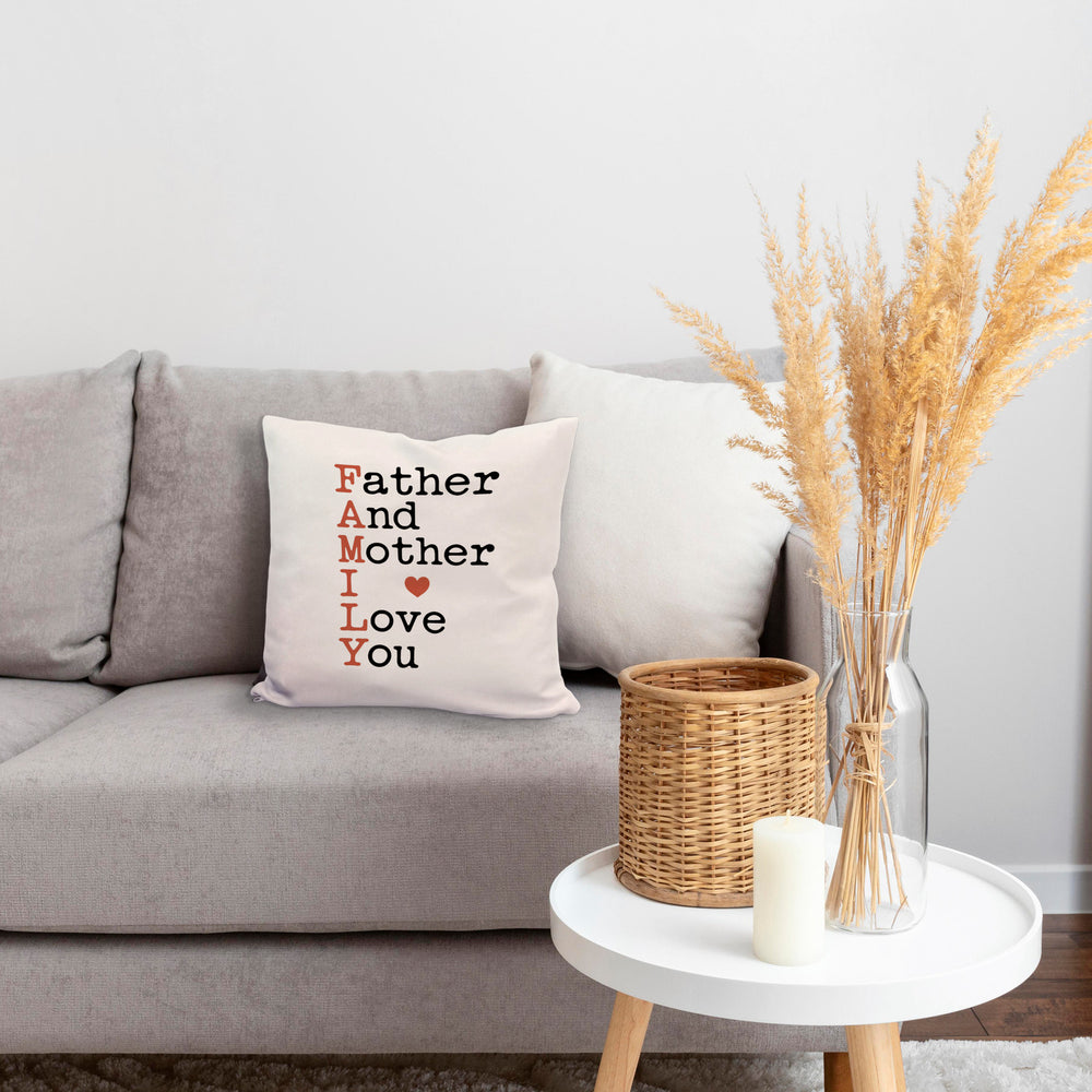 - Das FAMILY Herz Kissen ist eine Hommage an die Liebe zur Familie. Mit einem klaren, schreibmaschinenartigen Text, der die Worte "Father, And, Mother, I, Love, You" zeigt, und roten Anfangsbuchstaben, die FAMILY bilden, strahlt es Wärme aus. Ein kleines rotes Herz verleiht dem Design eine liebevolle Note.