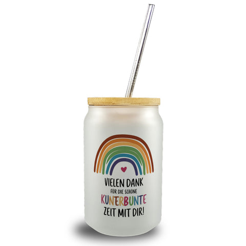 Vielen Dank für die kunterbunte Zeit Trinkglas mit Bambusdeckel mit Regenbogen