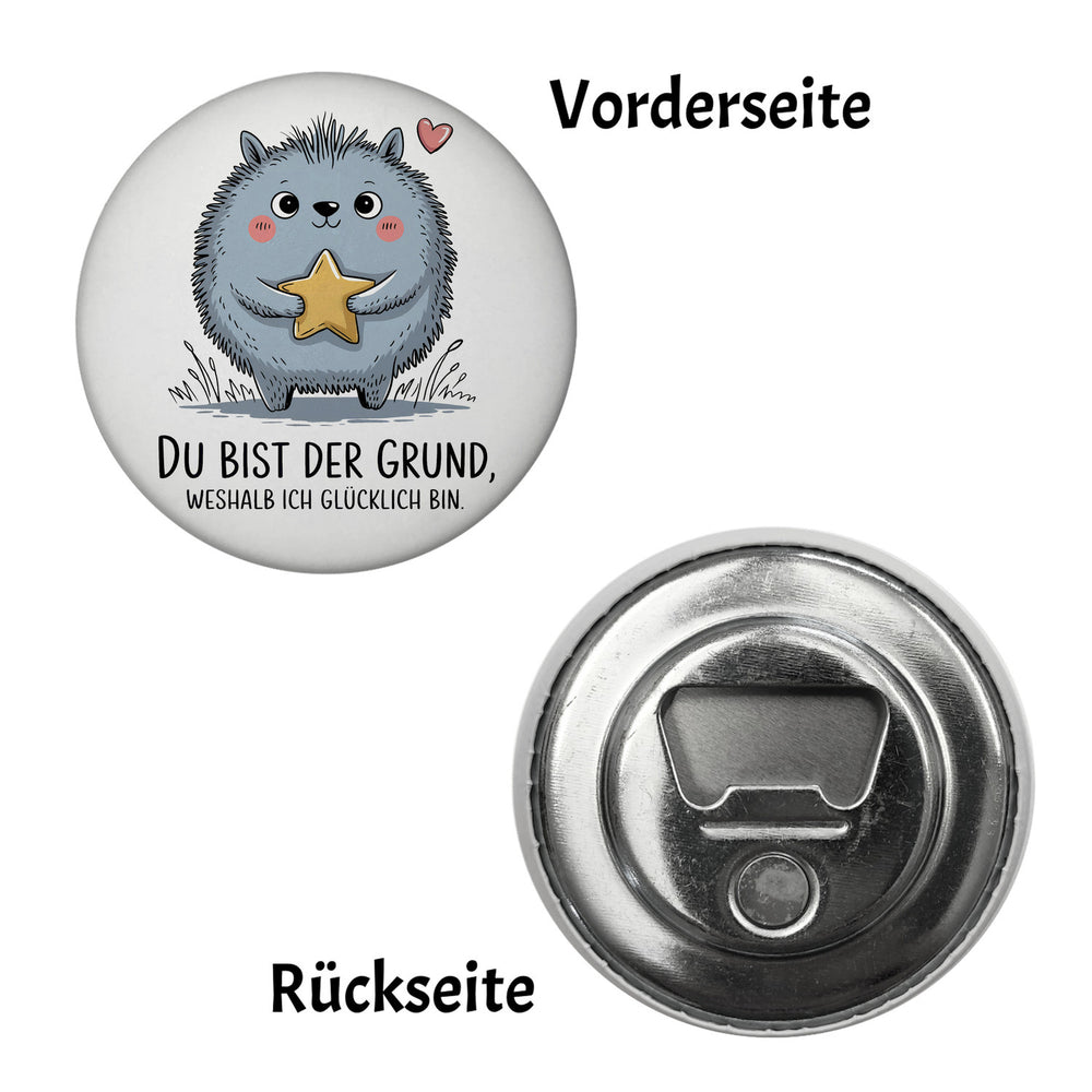Bereit, das Herz Ihrer Lieblingsmenschen zu erwärmen? Unser „Glücklich mit dir - Niedliches Wesen Magnet“ ist mehr als nur eine bezaubernde Dekoration. Er ist ein kleiner, flauschiger Botschafter der Liebe, der mit seinem goldenen Stern und dem berührenden Spruch „DU BIST DER GRUND, WESHALB ICH GLÜCKLICH BIN“ garantiert für strahlende Augen sorgt. Perfekt geeignet für jeden Kühlschrank oder als Hingucker auf einer Magnettafel – dieser Magnet ist ebenso bedeutungsvoll wie funktional!Erhältlich in einer Standardvariante oder mit integriertem Flaschenöffner, passt er sich perfekt Ihren Bedürfnissen an. Der hochwertige Druck aus unserer deutschen Magnet-Manufaktur sorgt für Langlebigkeit und einen unverwechselbaren Charme. Die liebevollen Details in Grau- und Goldtönen machen den Magneten zu einem unwiderstehlichen Blickfang und einer täglichen Erinnerung an die Kostbarkeit der zwischenmenschlichen Beziehungen.Ob als aufmerksames Geschenk zum Geburtstag, Jahrestag oder einfach als spontane Freude – dieser Magnet ist eine kleine Geste großer Wertschätzung. Ideal, um Ihren Liebsten ein Lächeln ins Gesicht zu zaubern und einen Hauch von Magie in den Alltag zu bringen. Schenken Sie Freude, heben Sie die Stimmung und bringen Sie ein Stück Glück mit diesem zauberhaften Magneten in Ihr Leben. Ein echter Herzensbrecher, bereit, Liebe zu verbreiten!