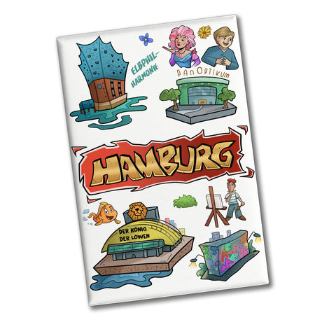 - Erleben Sie die pulsierende Energie von Hamburg mit diesem einzigartigen Souvenir-Magneten im Pop-Art-Comic-Stil. Das kunstvolle Design zeigt ikonische Wahrzeichen der Stadt wie die Elbphilharmonie, das Panoptikum und die Musical-Halle. Ein farbenfrohes Kunstwerk, das Hamburgs kulturelle Vielfalt perfekt einfängt.