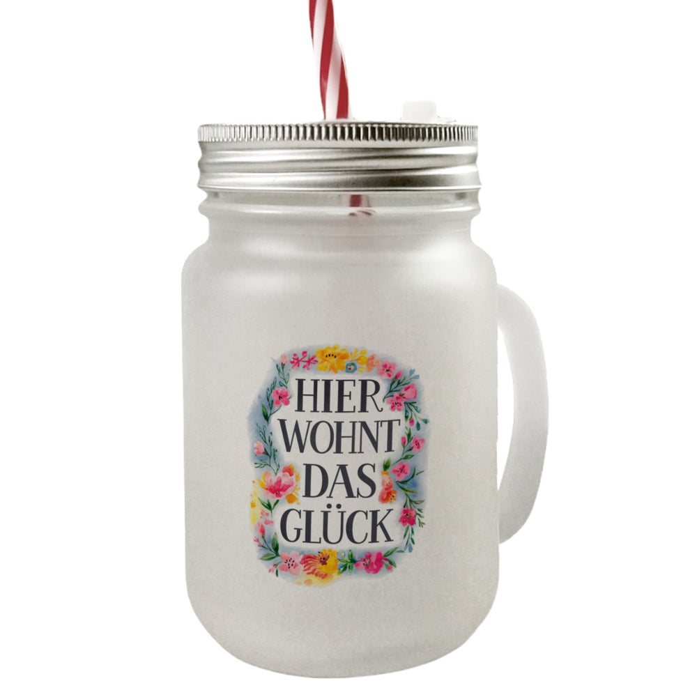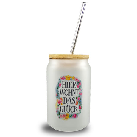 Hier wohnt Glück Trinkglas mit Bambusdeckel Blumenkranz
