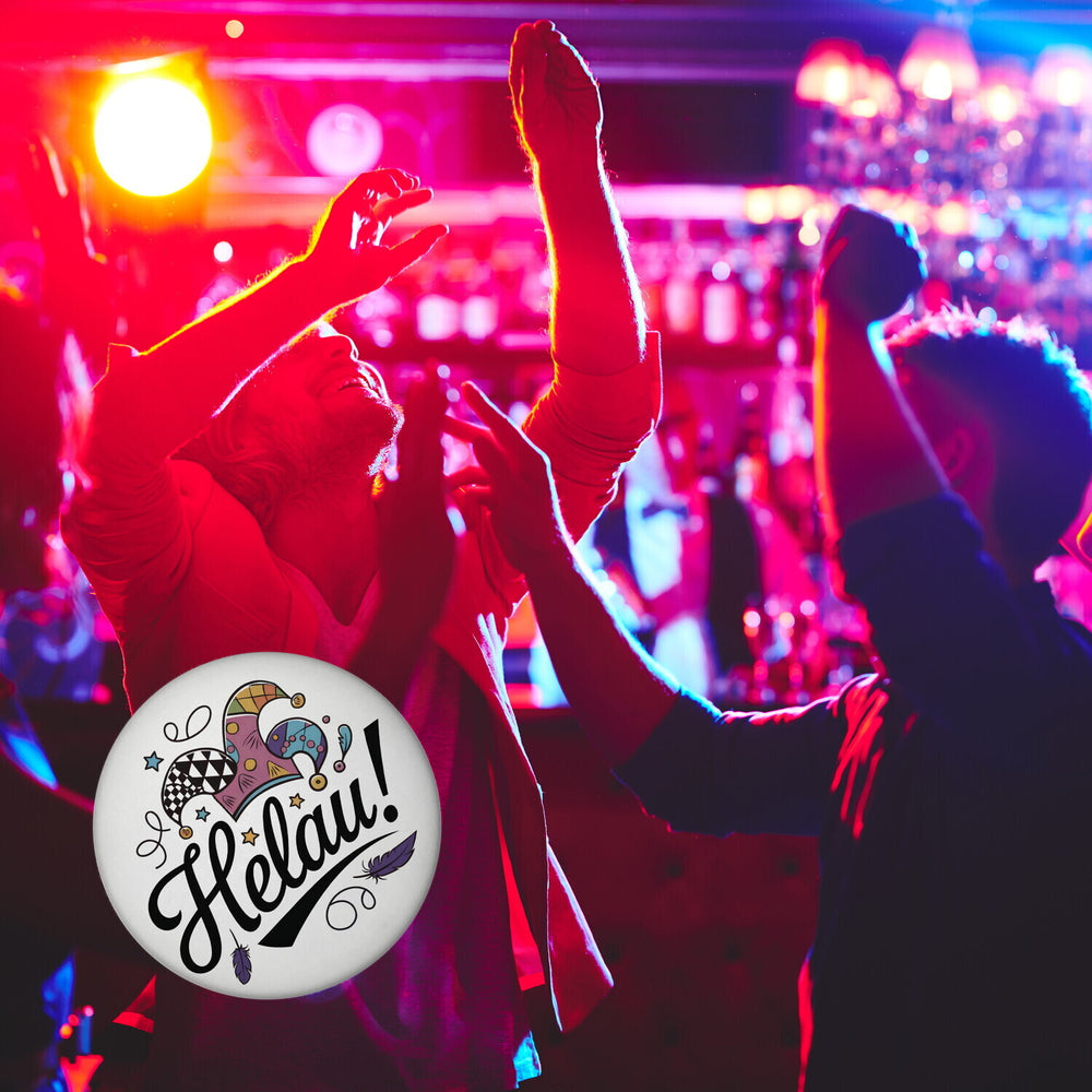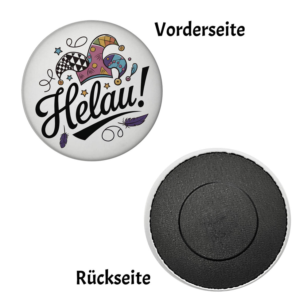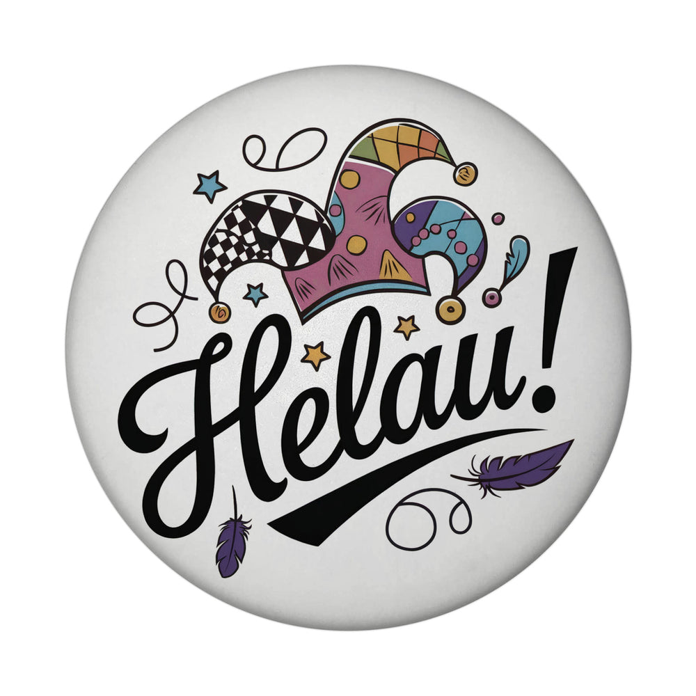 • Der runde Magnet präsentiert ein lebhaftes Narrenhut-Design mit dem Spruch "Helau!" in schwungvollen schwarzen Buchstaben. Farbenfrohe Elemente wie ein karierter, federschmückter Narrenhut und sternenartige Formen zieren den weißen Hintergrund. Ein echter Hingucker für Karnevalsfreunde!