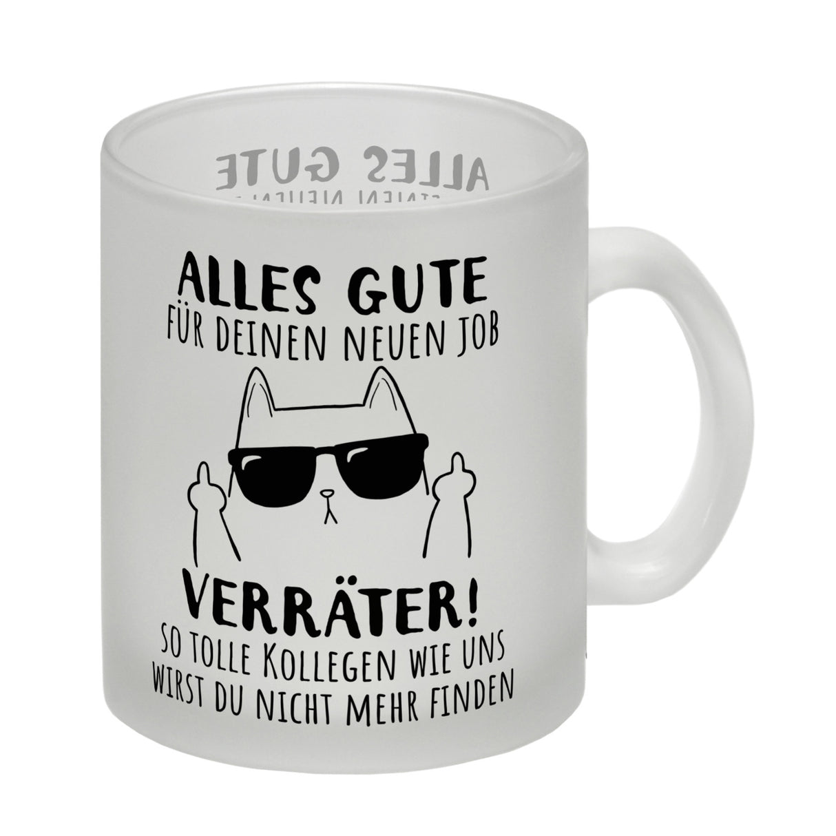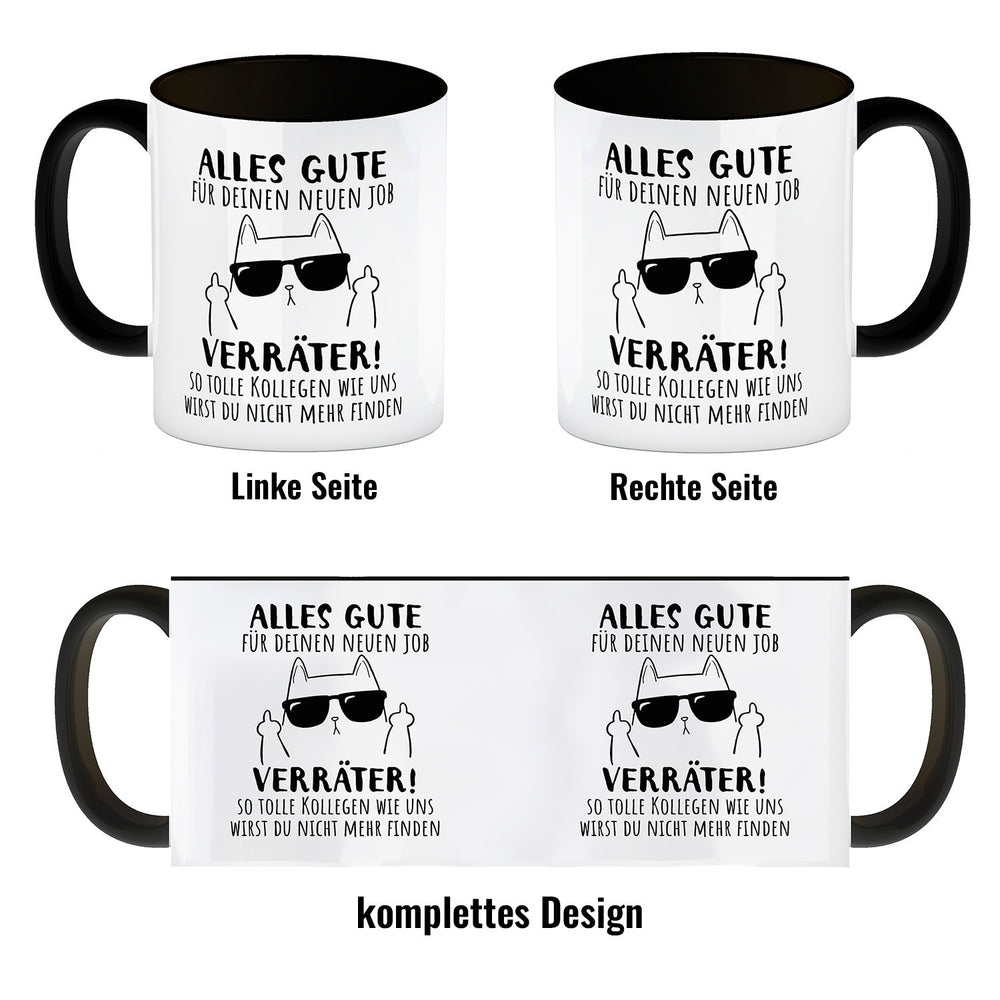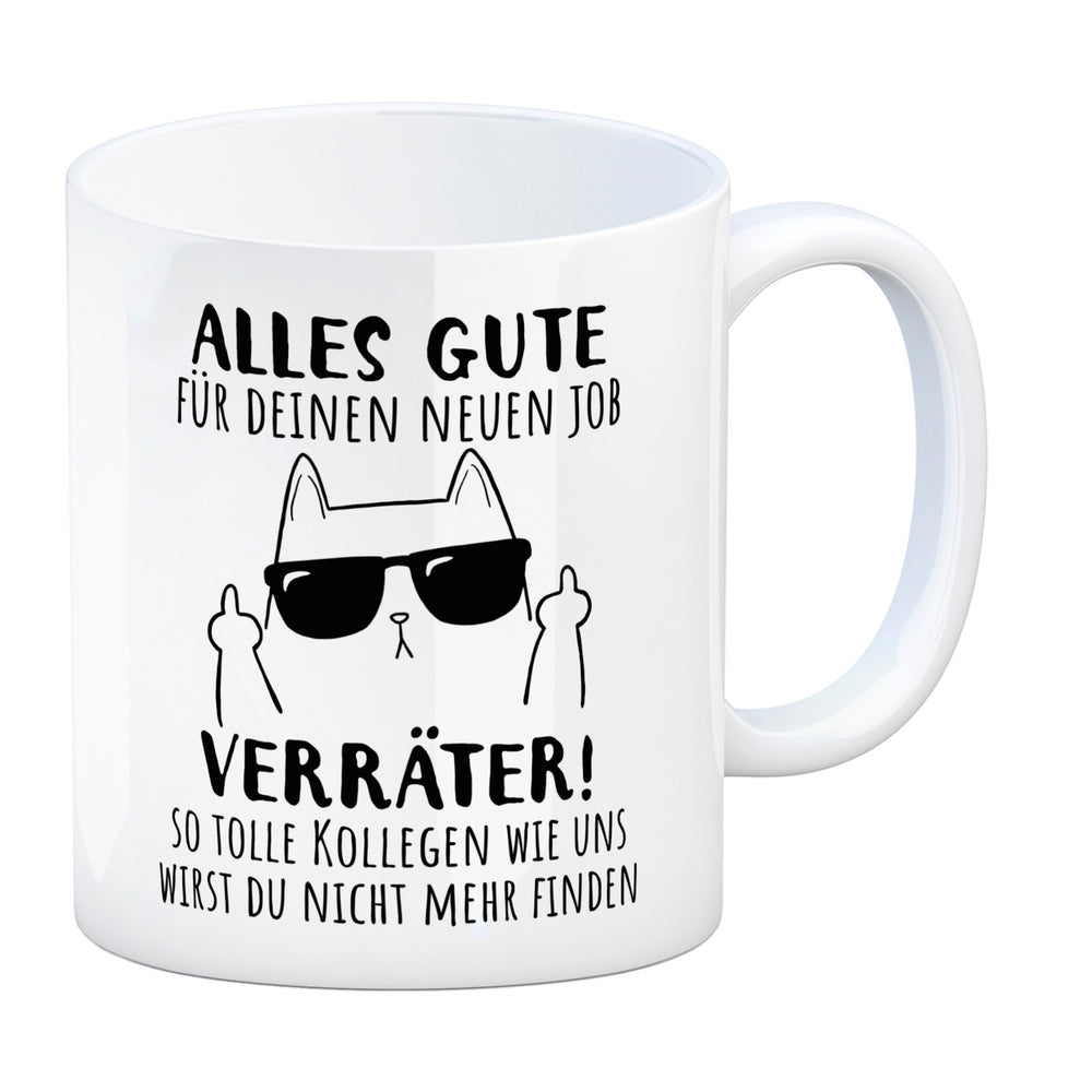 - Du kennst einen Kollegen, der den Job wechselt? Dieser Kaffeebecher wird ihn zum Lachen bringen! Mit einer Katze, die den Mittelfinger zeigt und einem frechen Spruch ausgestattet, ist er das perfekte Abschiedsgeschenk. „Alles Gute für deinen neuen Job, Verräter!“ – das wird er nie vergessen!