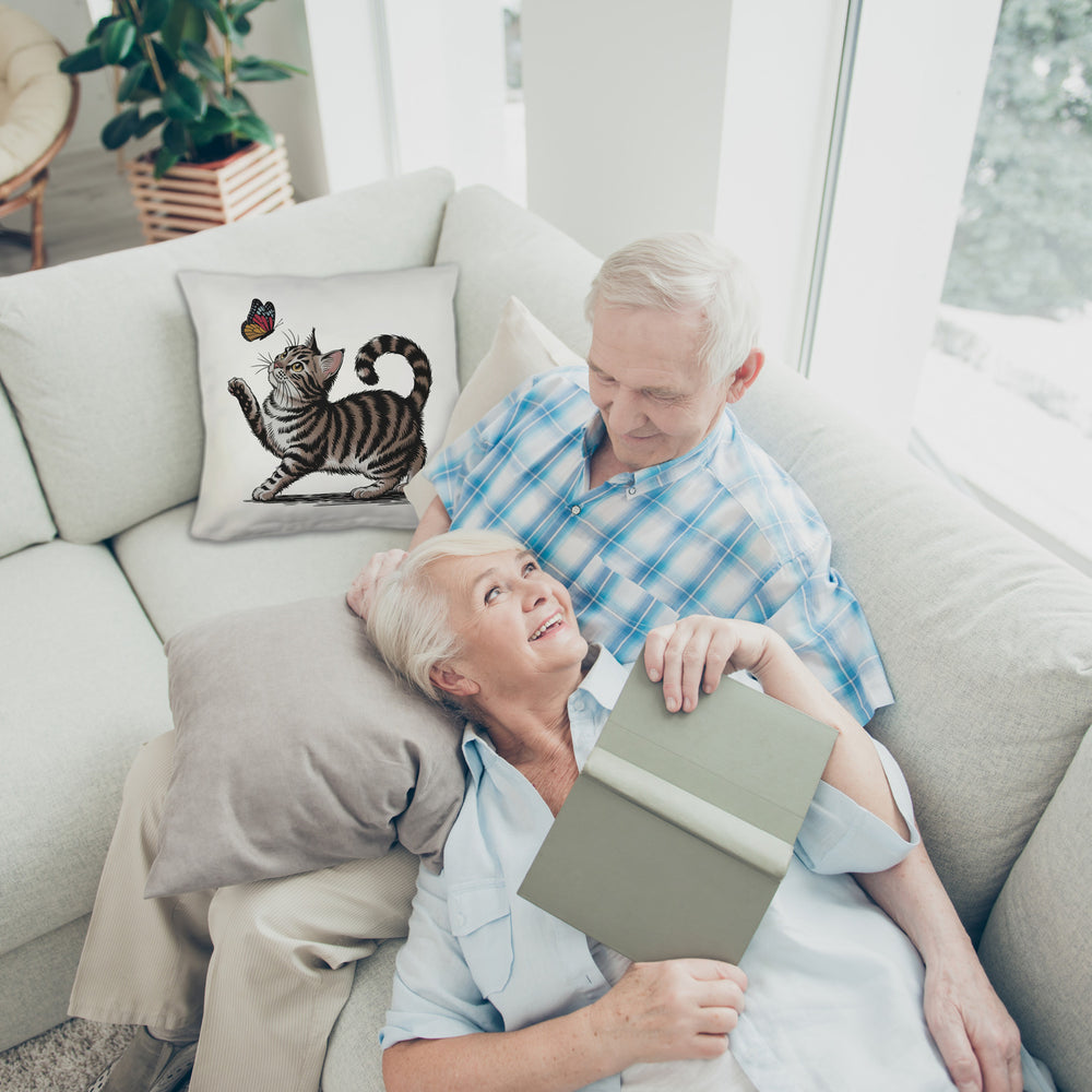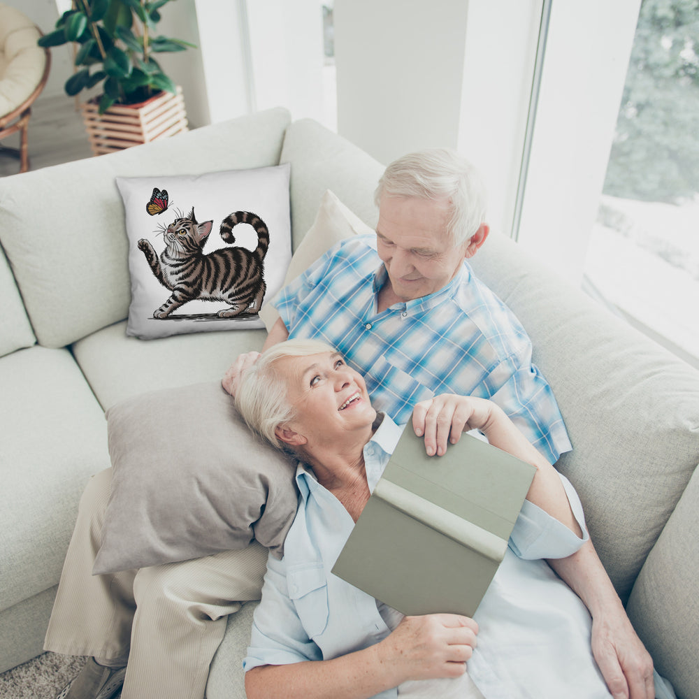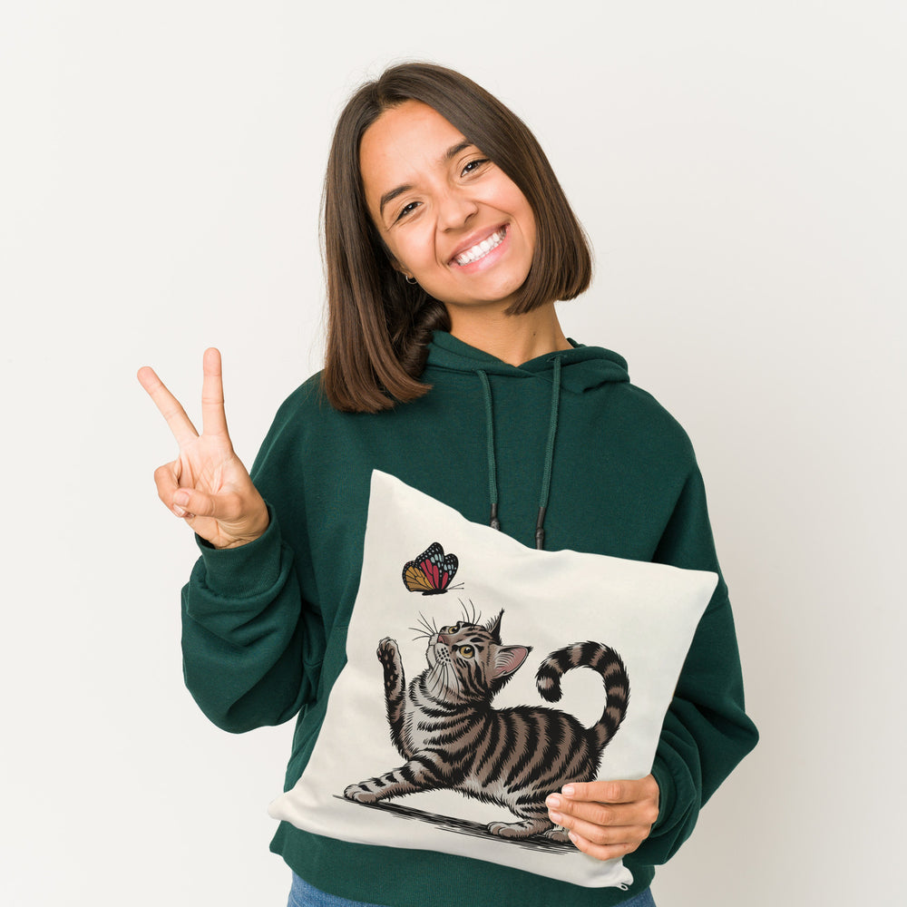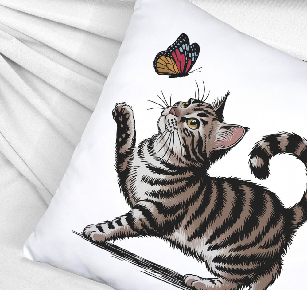 • Dieses entzückende Dekokissen zeigt eine gestreifte Katze in spielerischer Pose, die fasziniert einen bunten Schmetterling beobachtet. Mit ihrem erhobenen Pfötchen und dem gekrümmten Schwanz ist die Szene auf einem schlichten weißen Hintergrund besonders niedlich und ansprechend. Es ist die perfekte Ergänzung für jedes Sofa oder Bett.