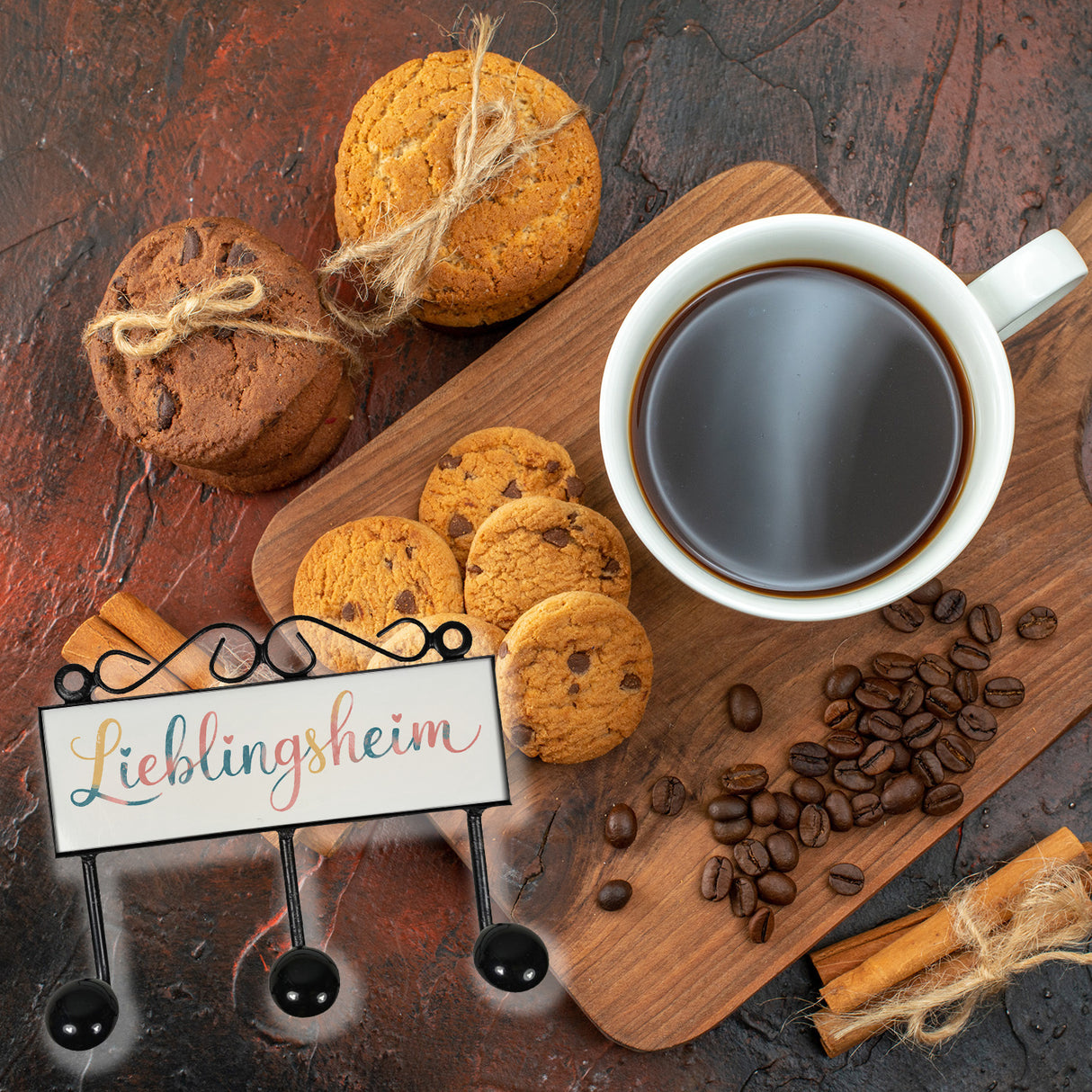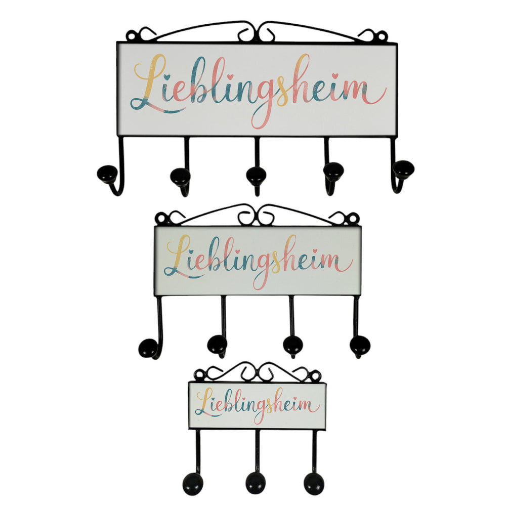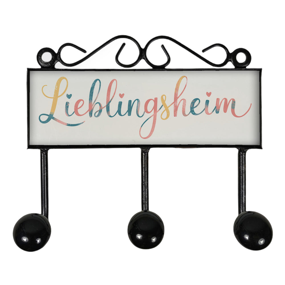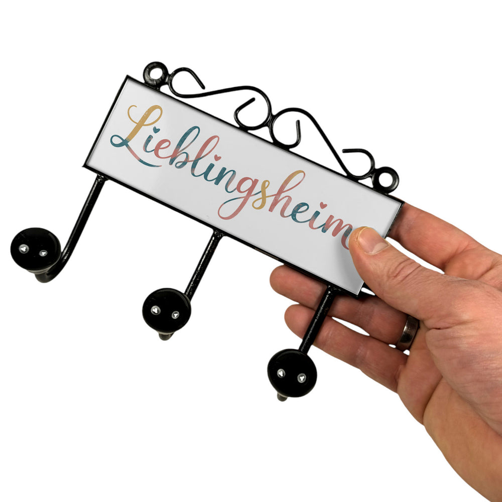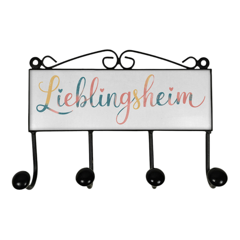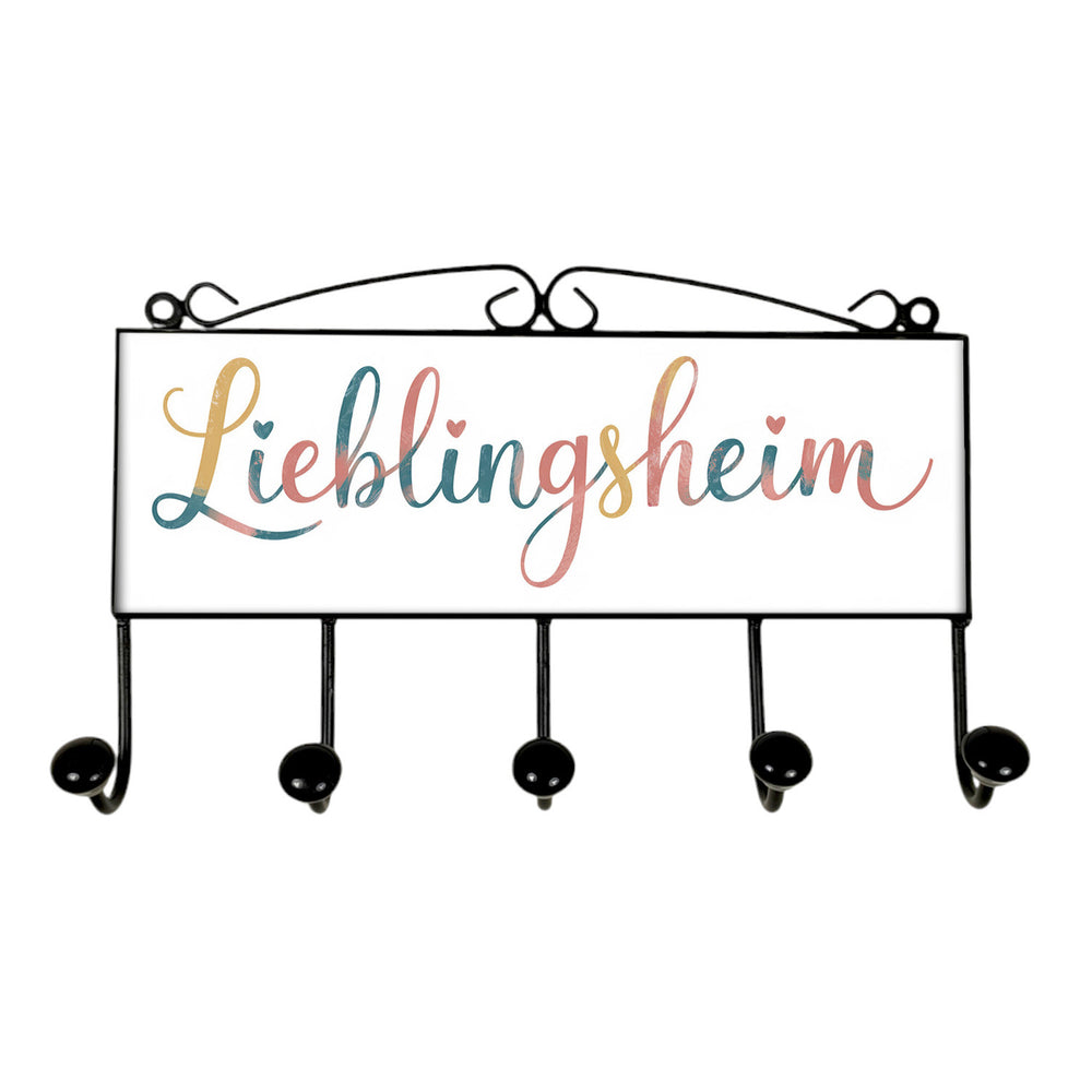 - Die Lieblingsheim Kleiderhakenleiste vereint Retro-Charme mit einem liebevollen Herzmotiv. Der geschwungene Schriftzug "Lieblingsheim" ist von zarten Herzen umrahmt und ruht auf einem sanft pastellfarbenen Hintergrund. Mit den Farben Rosa, Blau und Gelb bringt diese Hakenleiste eine warme, einladende Atmosphäre in jedes Zimmer.