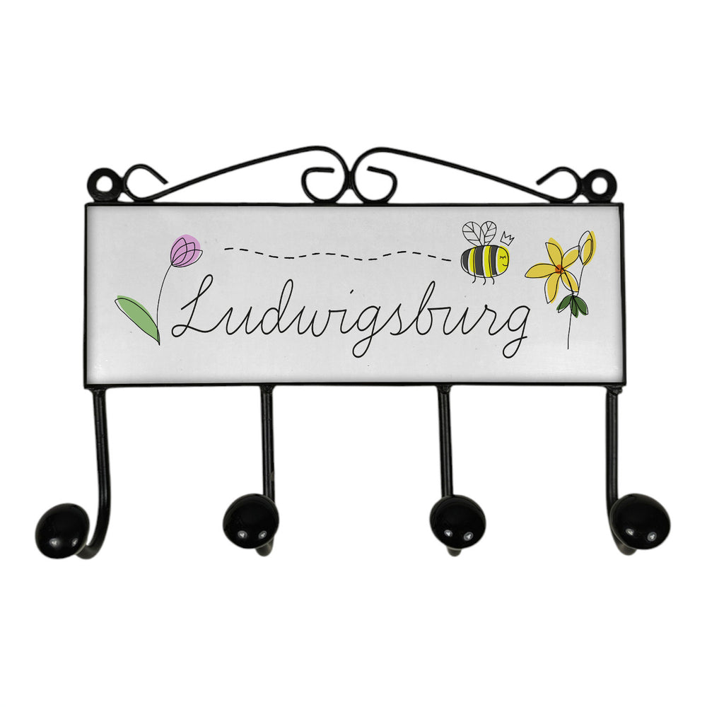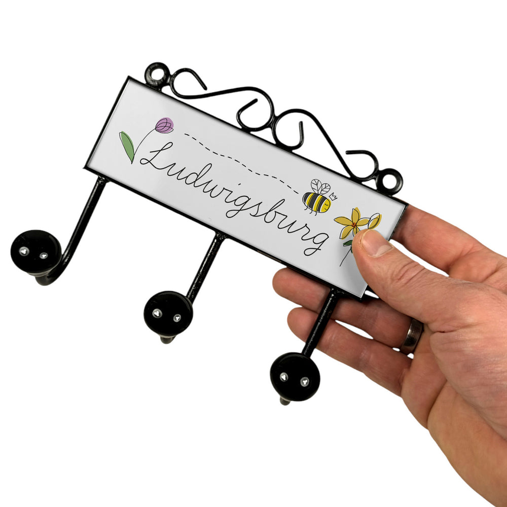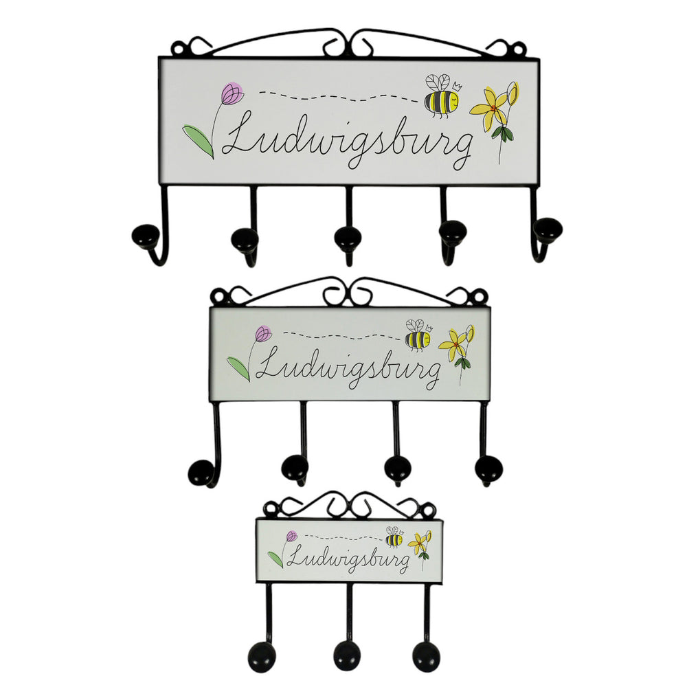 - Die Ludwigsburg Kleiderhaken Leiste Ludwigsbiene ist eine charmante Wandgarderobe im Retro-Stil. Mit verspieltem Design zeigt sie 'Ludwigsburg' in schwarzer Schreibschrift, flankiert von bunten Blumen und einer lustigen Biene. Der weiße Hintergrund sorgt für ein sauberes und luftiges Erscheinungsbild.