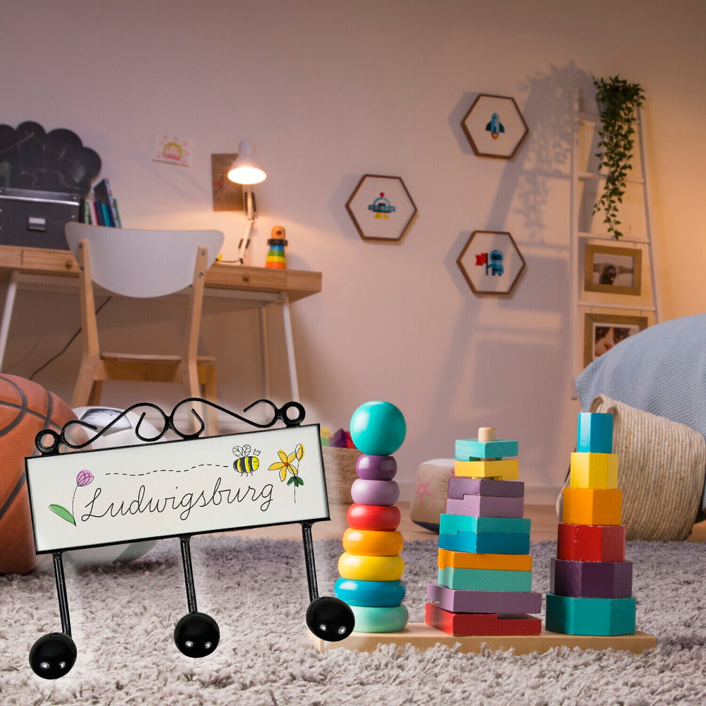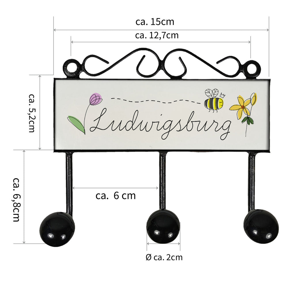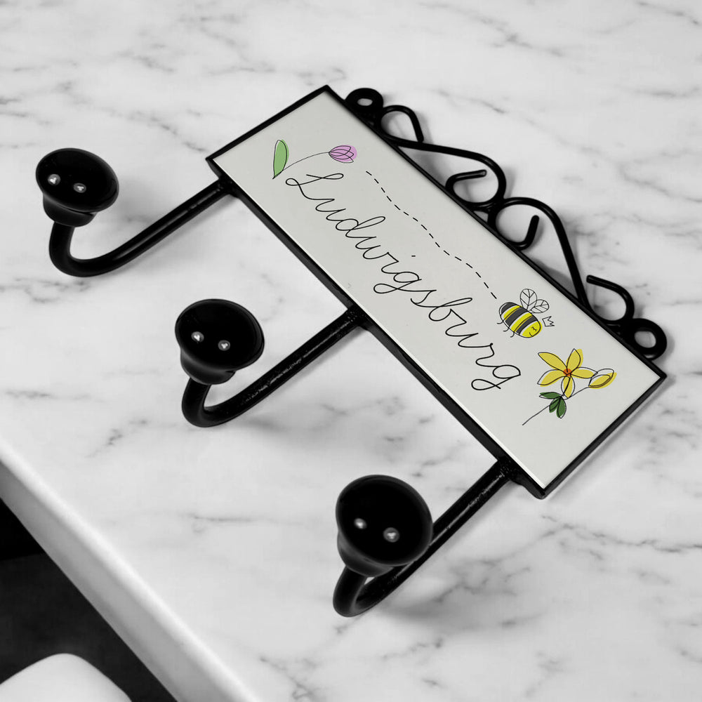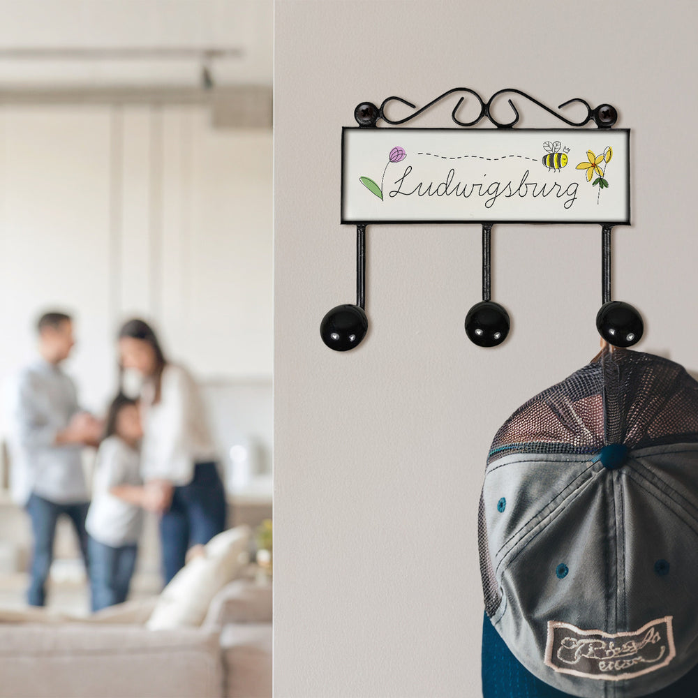 - Die Ludwigsburg Kleiderhaken Leiste Ludwigsbiene ist eine charmante Wandgarderobe im Retro-Stil. Mit verspieltem Design zeigt sie 'Ludwigsburg' in schwarzer Schreibschrift, flankiert von bunten Blumen und einer lustigen Biene. Der weiße Hintergrund sorgt für ein sauberes und luftiges Erscheinungsbild.