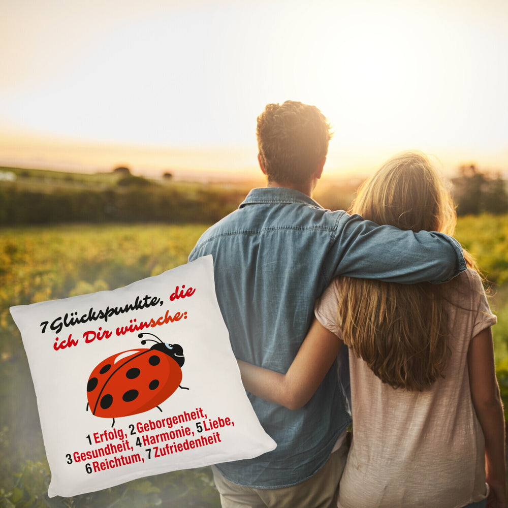 • 1x Marienkäfer Kissen mit Spruch Sieben Glückspunkte in der gewählten Ausführung