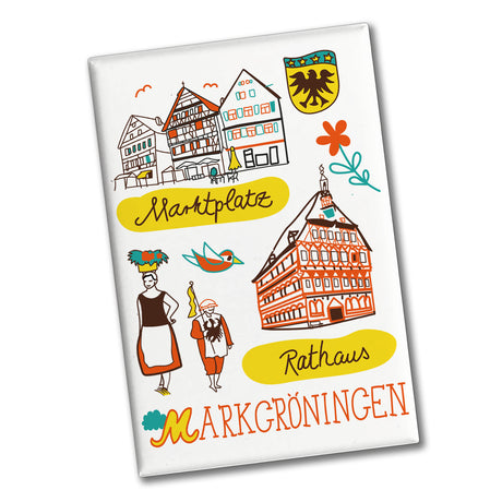 - Der Markgröningen Wimmelbild Souvenir Magnet bringt den historischen Charme des Marktplatzes am Rathaus direkt an Ihren Kühlschrank. Die lebendige Illustration zeigt ein traditionelles Fachwerkhaus, das historische Rathaus und die berühmten Figuren des 'Schäferlaufes'. Ein schwarzer Adler, ein farbenfroher Vogel und eine Blume runden das nostalgische Bild ab.