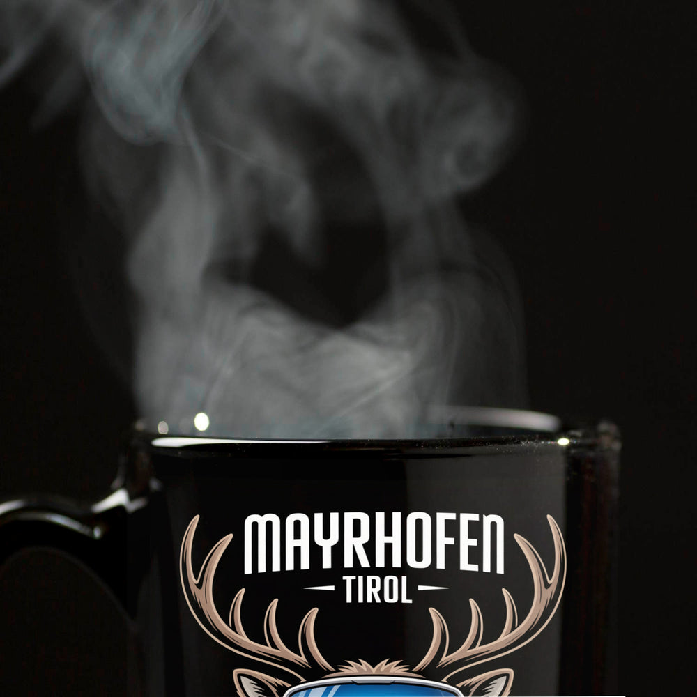 Die MAYRHOFEN Tirol Tasse begeistert durch ein faszinierendes Design: Ein stolzer Rothirsch mit modernen Schneebrillen vor tiefschwarzem Hintergrund. Die Geweihstangen rahmen einen atemberaubenden Panoramablick auf schneebedeckte Berge ein. Die markante A Hinweise: Fassungsvermögen: ca. 300ml