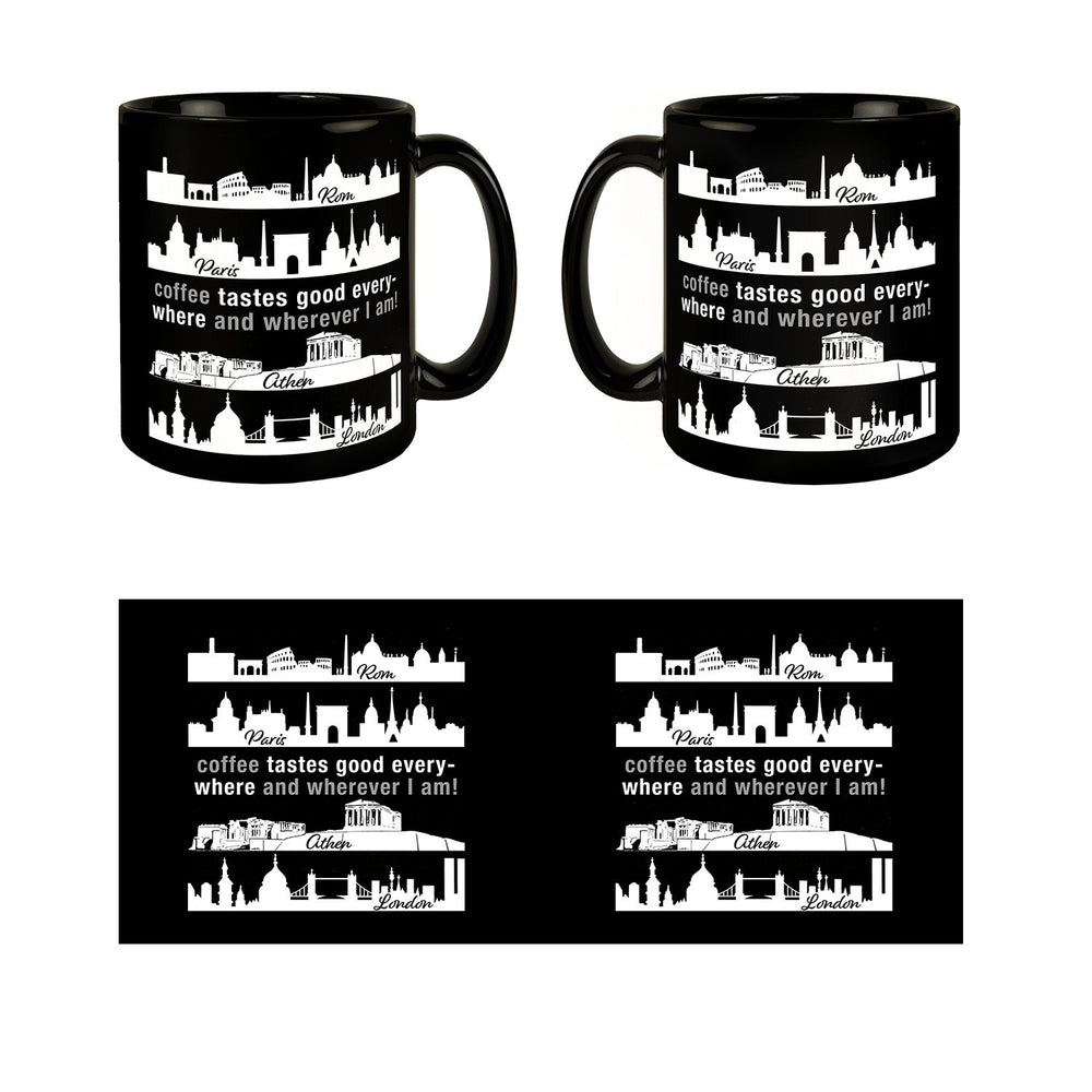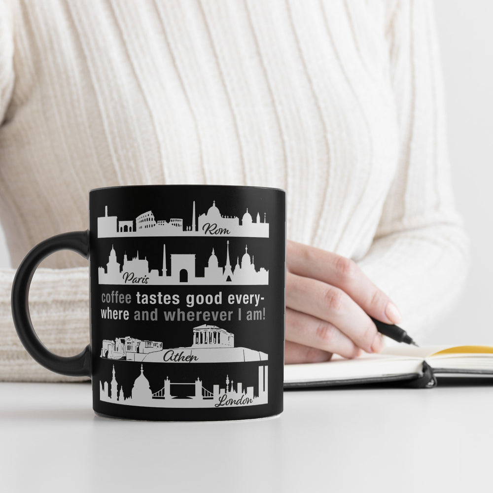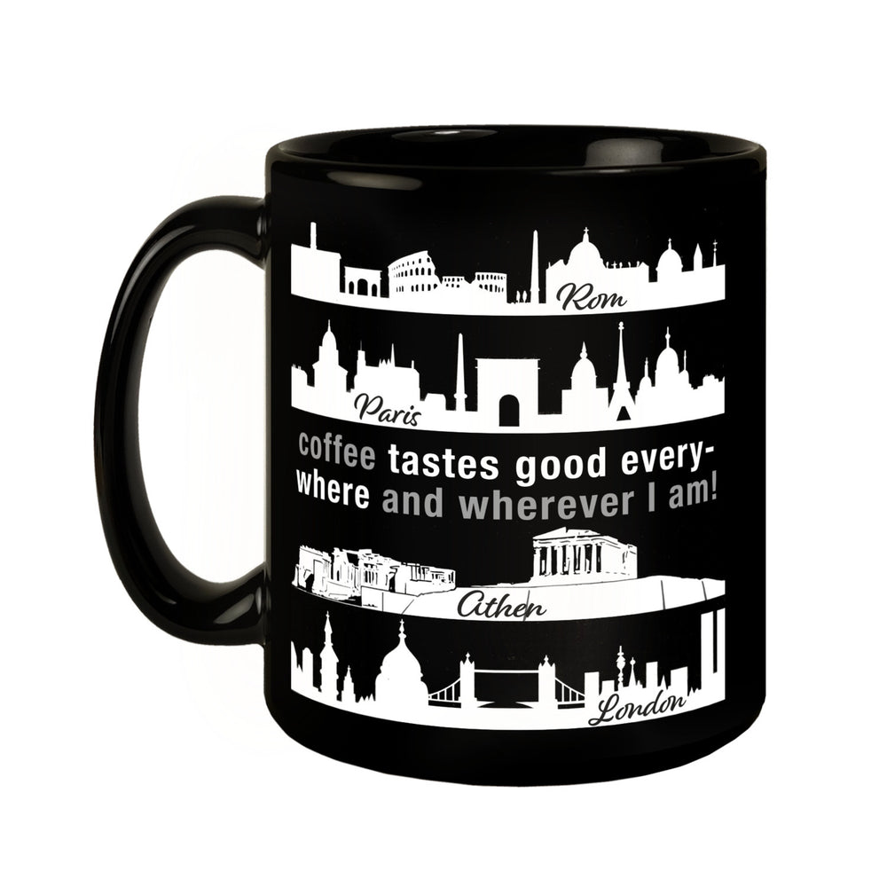 - Diese stylische Tasse in elegantem Schwarz präsentiert die Silhouetten von Paris, London, Rom und Athen. Der witzige Spruch "Coffee tastes good everywhere!" zieht alle Blicke auf sich. Jeder Schluck wird zum urbanen Abenteuer, während du gedanklich durch die charmanten Straßen europäischer Metropolen wanderst.