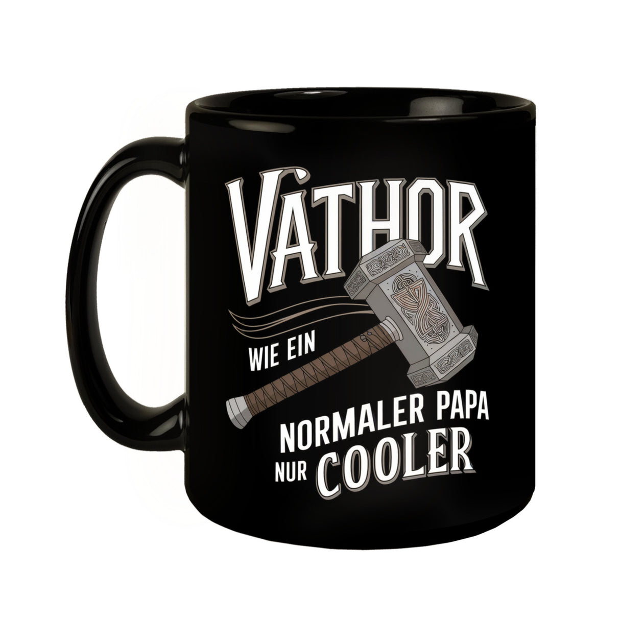 - Die coole VATHOR-Tasse beeindruckt mit ihrem schwarzen Design und einem auffälligen nordischen Hammer. Verziert mit kunstvollen Mustern und einer Kette am Griff, macht dieser Becher jeden Morgen mythisch. Der kraftvolle Spruch "Wie ein normaler Papa nur viel cooler" sorgt für ein Schmunzeln bei jedem Kaffeegenuss.
