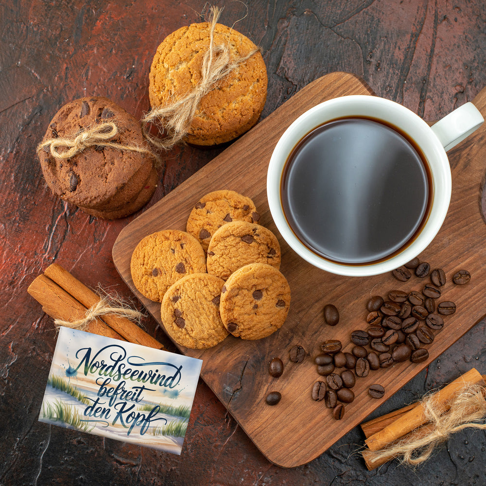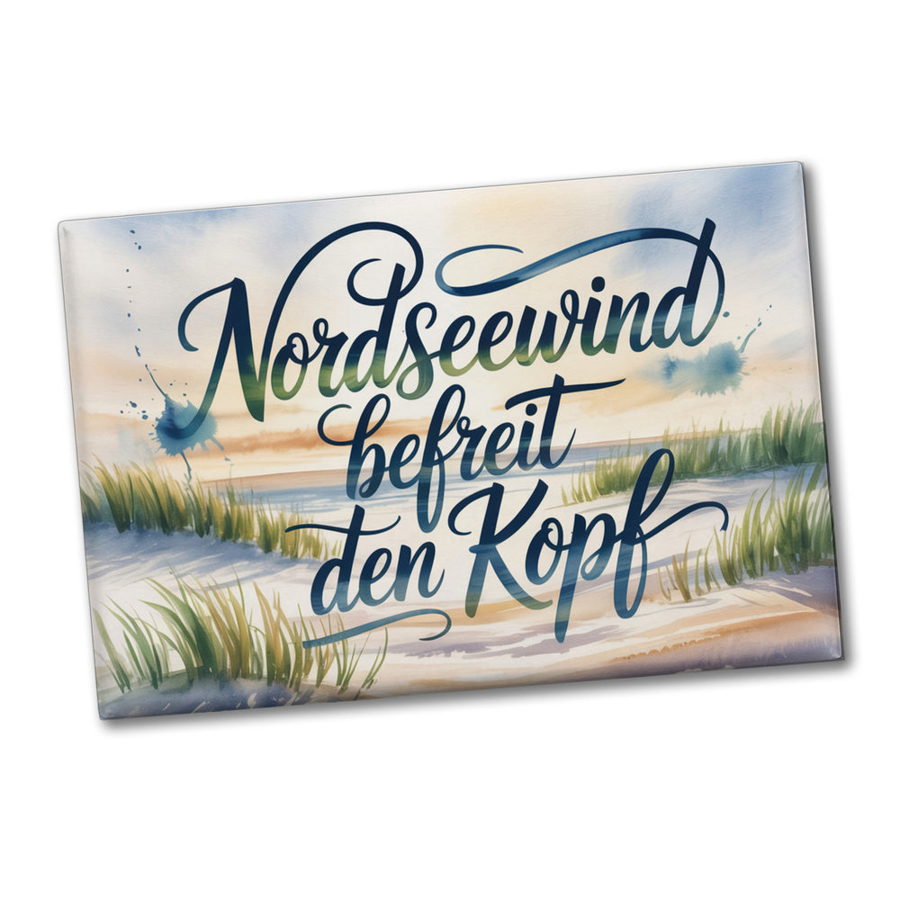 Der Nordsee Aquarell Souvenir Magnet ist ein rechteckiger Magnet, der ein wunderschönes Aquarellgemälde mit dem Spruch "Nordseewind befreit den Kopf" zeigt. Der Text ist in fließender, leicht unvollkommener Schrift gehalten, mit sanften, harmonisc Hinweise: Größe: ca. 8x5,5 cm