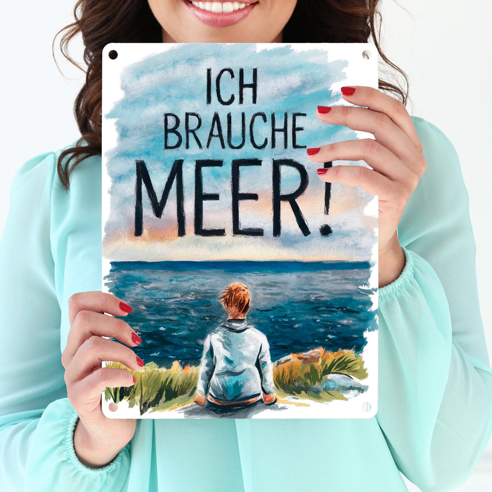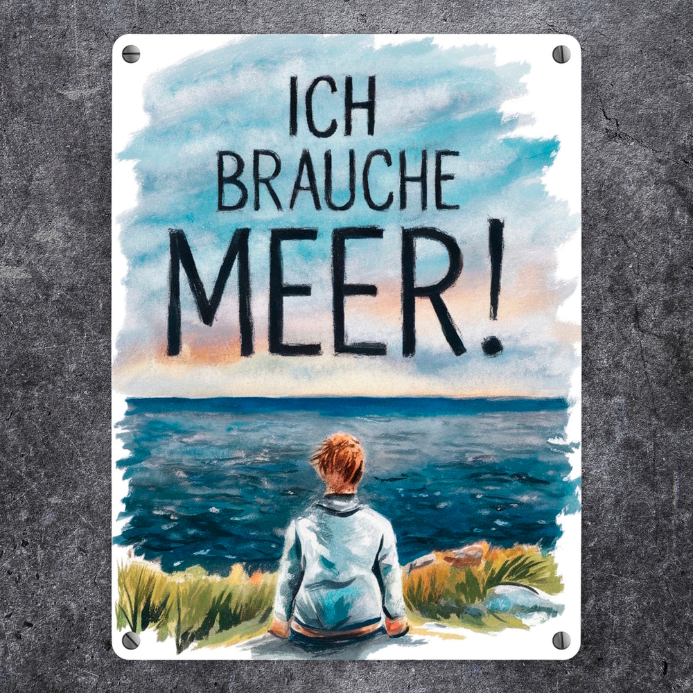 - Dieses Metallschild zeigt eine Person mit rötlichem Haar und heller Jacke, die sehnsüchtig aufs Meer blickt. Der Aquarellstil auf weißem Hintergrund vermittelt Ruhe und Fernweh. Darüber prangen in fetten schwarzen Buchstaben die Worte: "ICH BRAUCHE MEER!". Ein echtes Highlight für Meerliebhaber!