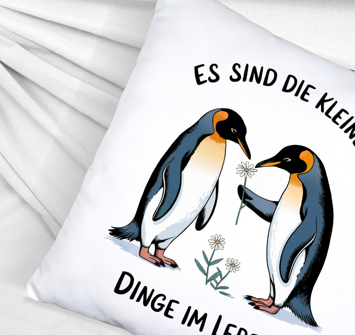 - Das lustige Pinguin-Dekokissen zeigt zwei charmante Pinguine. Einer steht aufrecht, der andere lehnt sich nach vorne und überreicht Blumen. Mit dem Spruch „Es sind die Kleinen Dinge im Leben“ verleiht das Kissen jedem Raum eine süße, nachdenkliche Atmosphäre. Perfekt für jeden, der kleine Gesten im Leben schätzt!