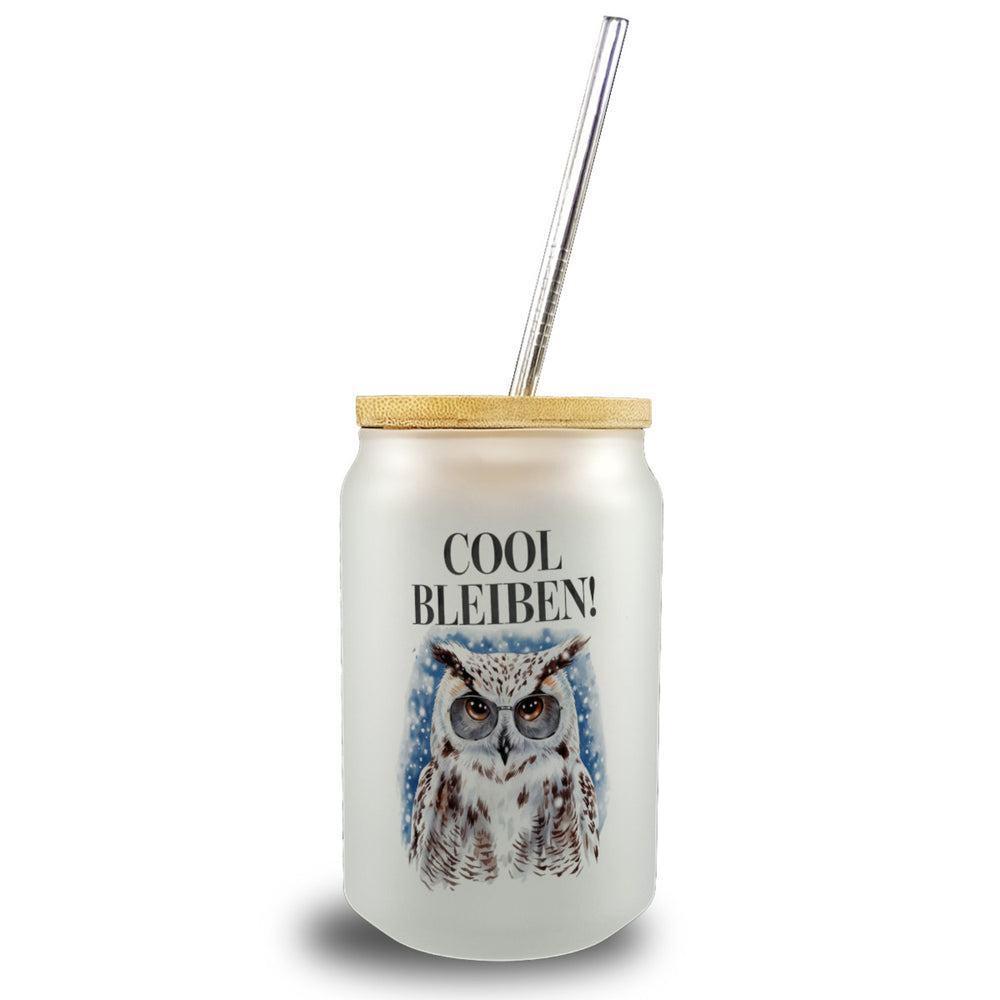 Cool bleiben Trinkglas mit Bambusdeckel Schneeeule mit Sonnenbrille
