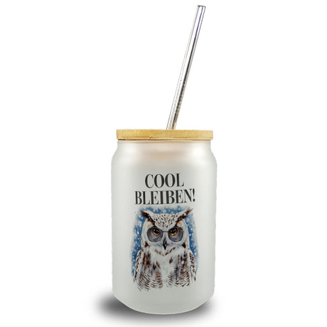 - 1x Schneeeule mit Sonnenbrille Cool bleiben Trinkglas mit Bambusdeckel mit Bambusdeckel oder Henkel