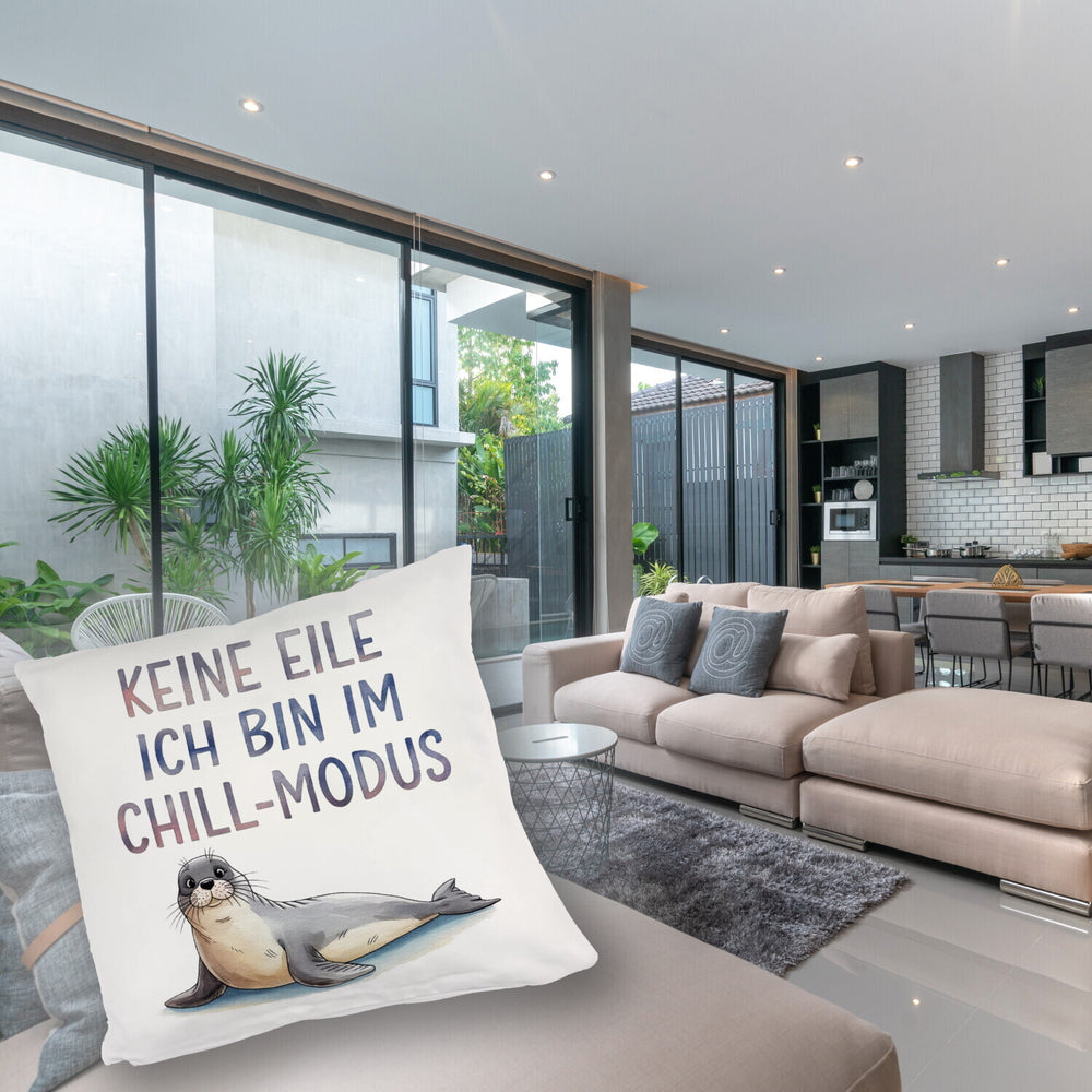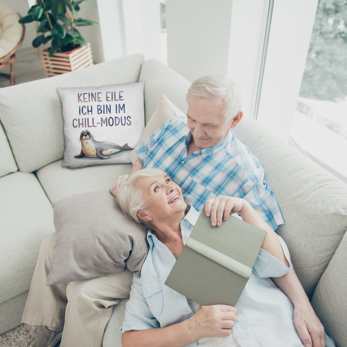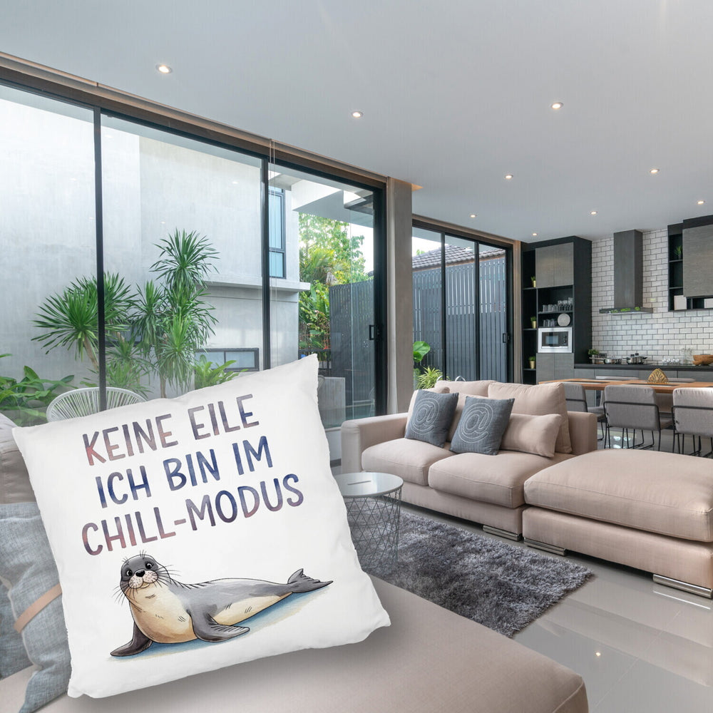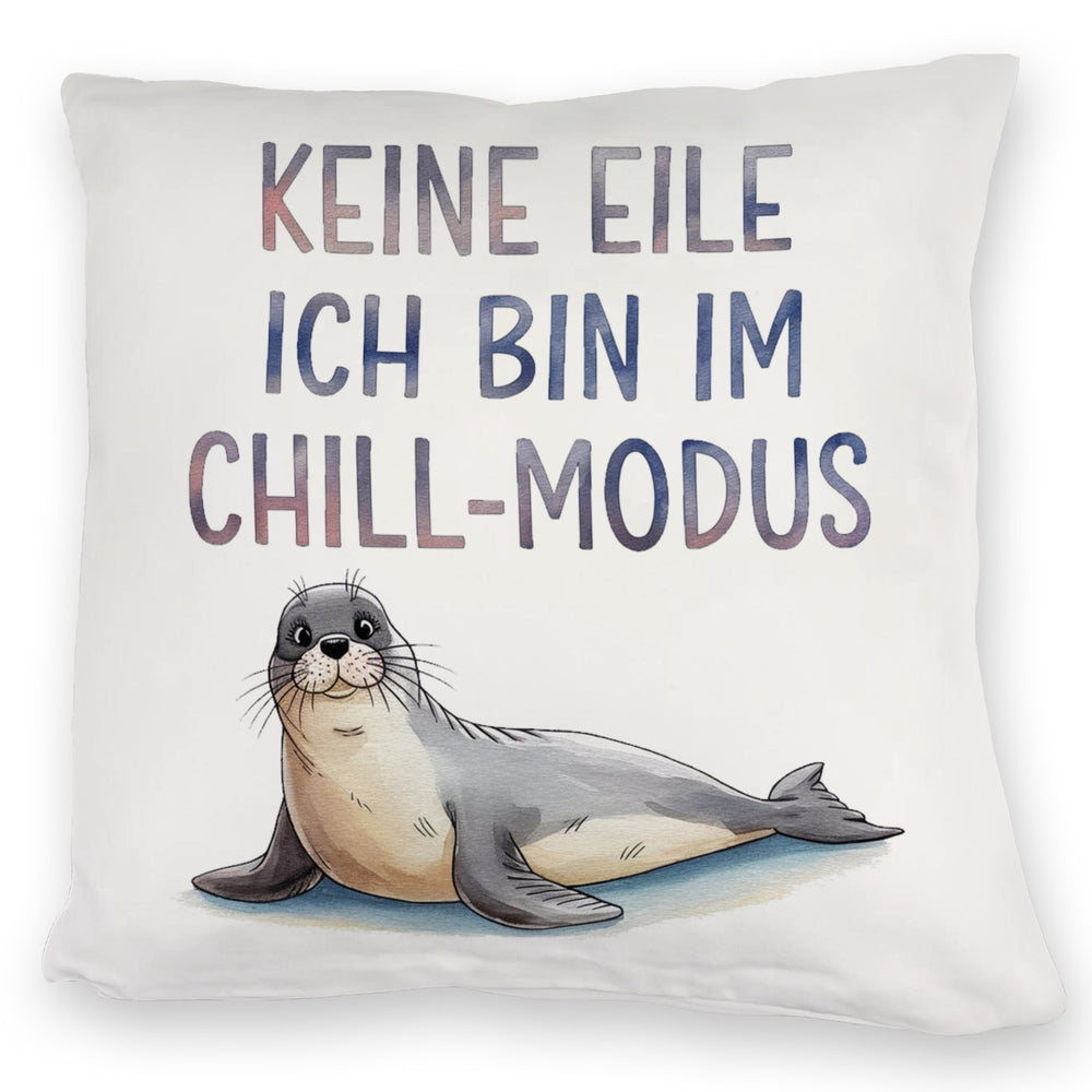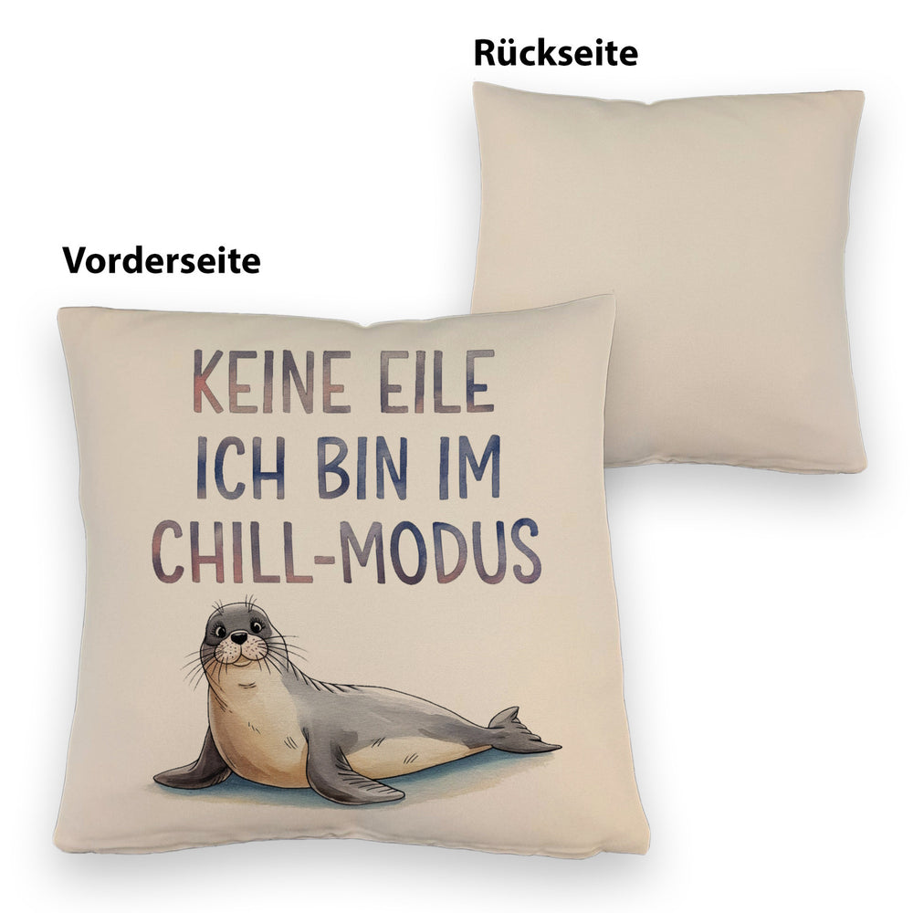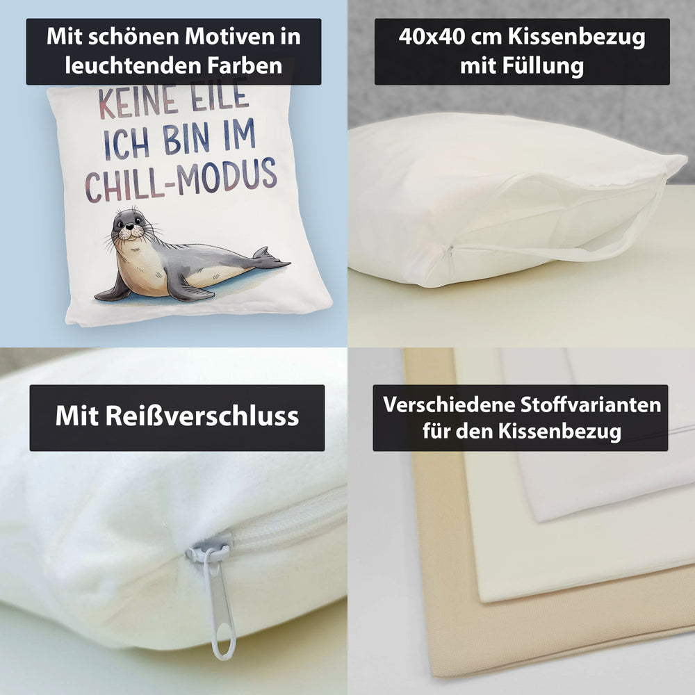 • Das Kissen ziert ein entspannter Seehund in Chill-Modus, der lässig auf sandigem Untergrund liegt. Der farbenfrohe Schriftzug "KEINE EILE, ICH BIN IM CHILL-MODUS" in Pastellfarben bringt die gelassene Stimmung perfekt zur Geltung. Der weiße Hintergrund sorgt dafür, dass das niedliche Motiv sofort ins Auge fällt.