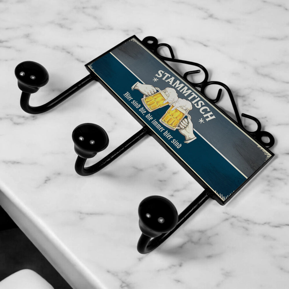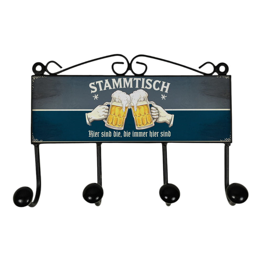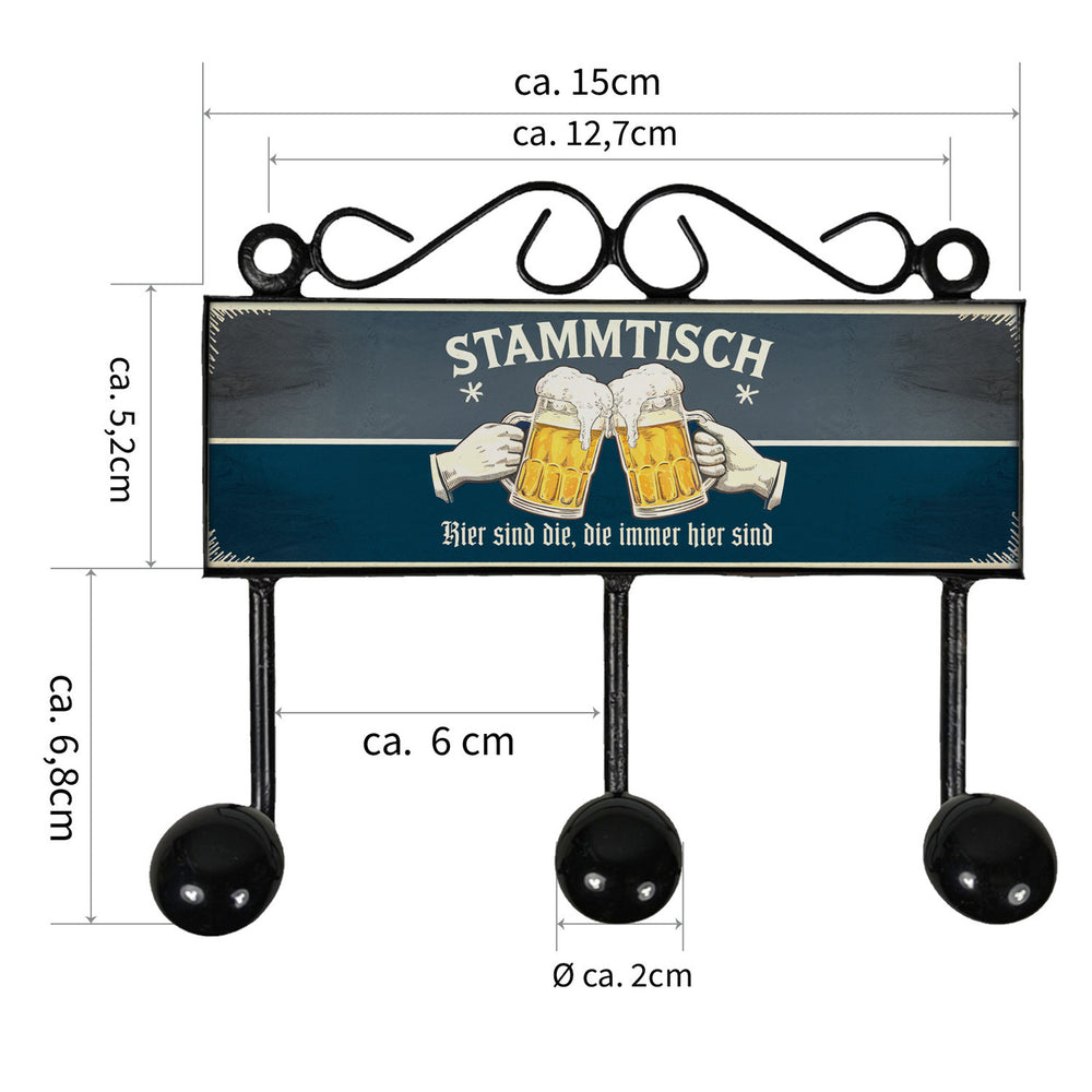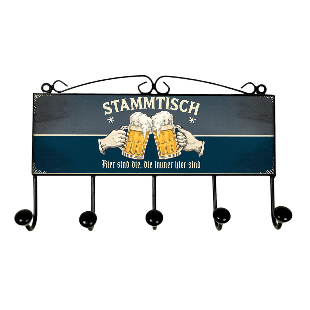 - Die lustige Garderobenleiste im Retro-Look vereint Nostalgie mit Spaß. Auf einem tief grauen und blauen Hintergrund prangt groß 'Stammtisch', darunter zwei Hände, die mit Biergläsern anstoßen. Der Vintage-Style macht sie zum Hingucker in jedem Wohnzimmer oder Flur und bringt Tradition in dein Zuhause.