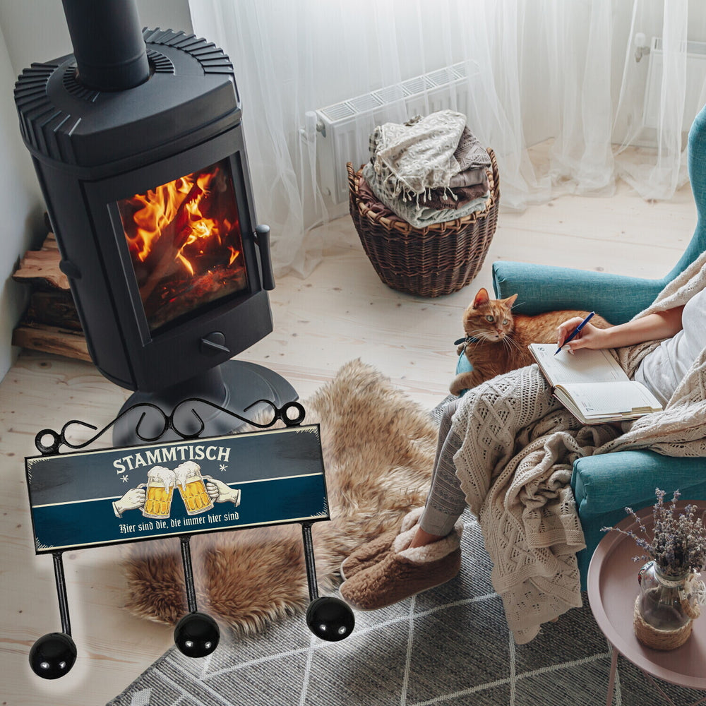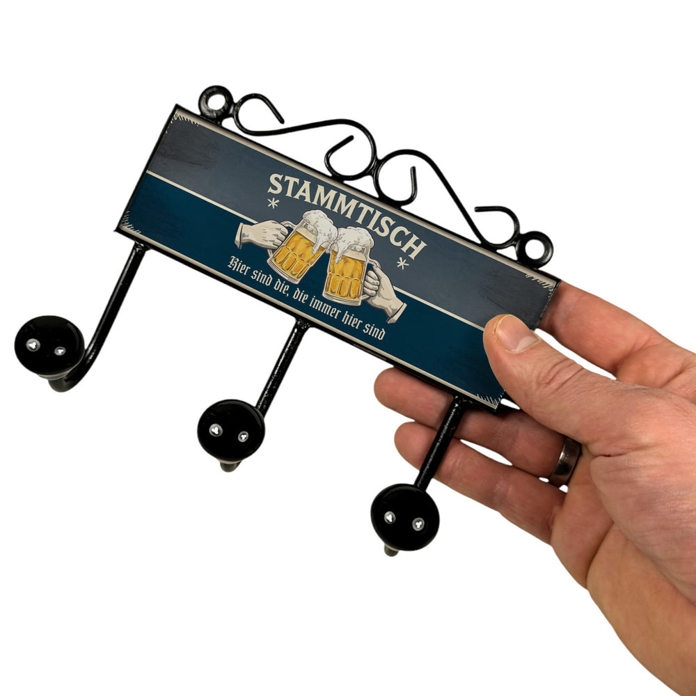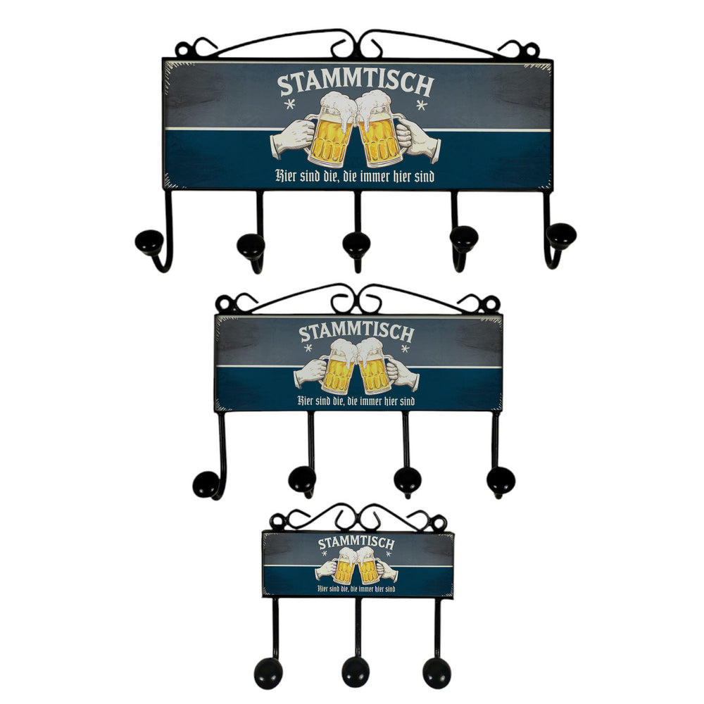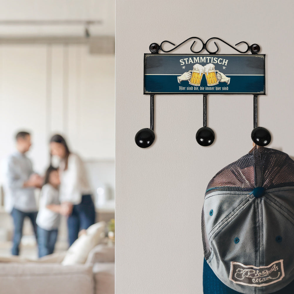 - Die lustige Garderobenleiste im Retro-Look vereint Nostalgie mit Spaß. Auf einem tief grauen und blauen Hintergrund prangt groß 'Stammtisch', darunter zwei Hände, die mit Biergläsern anstoßen. Der Vintage-Style macht sie zum Hingucker in jedem Wohnzimmer oder Flur und bringt Tradition in dein Zuhause.