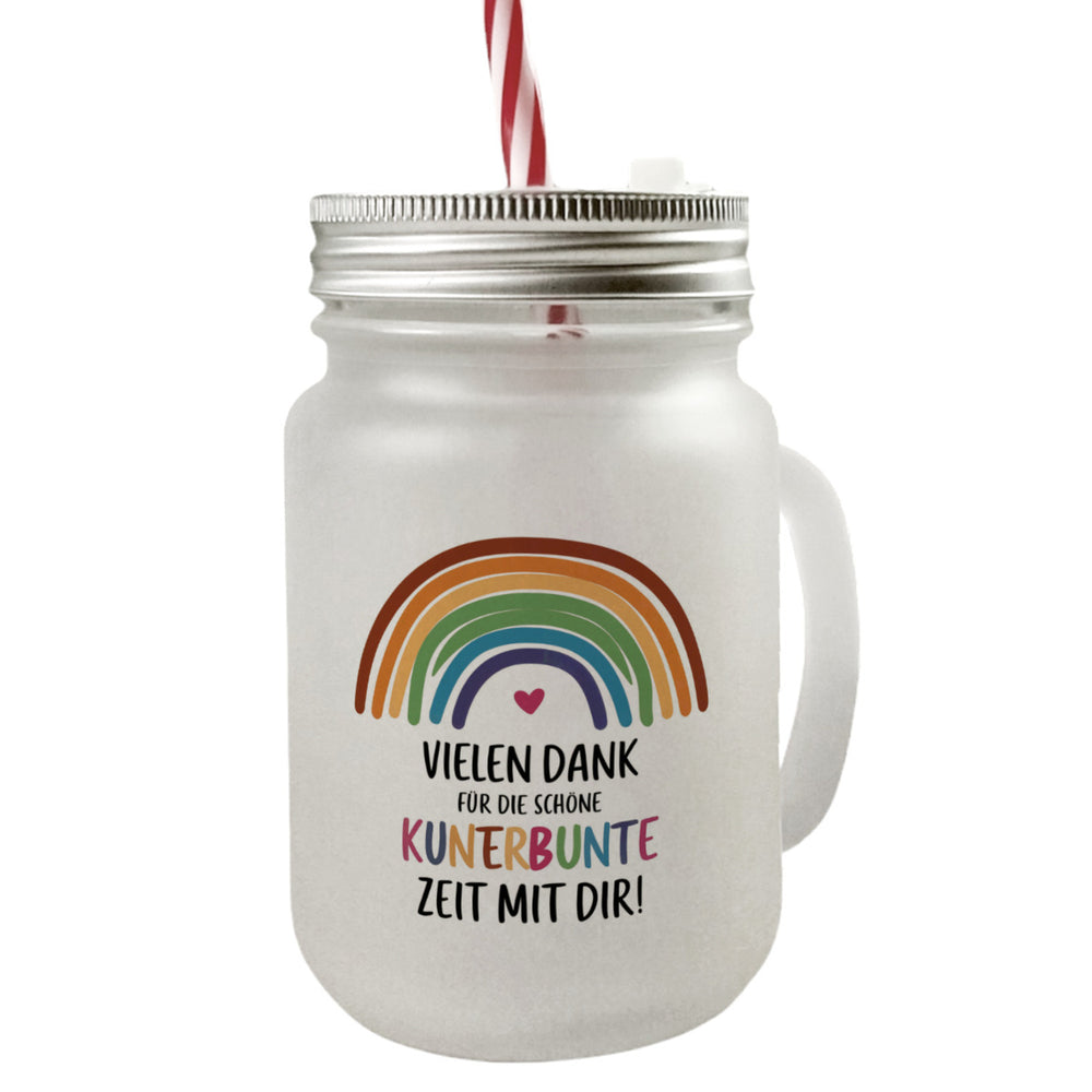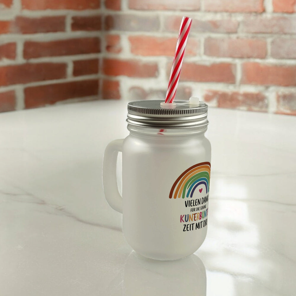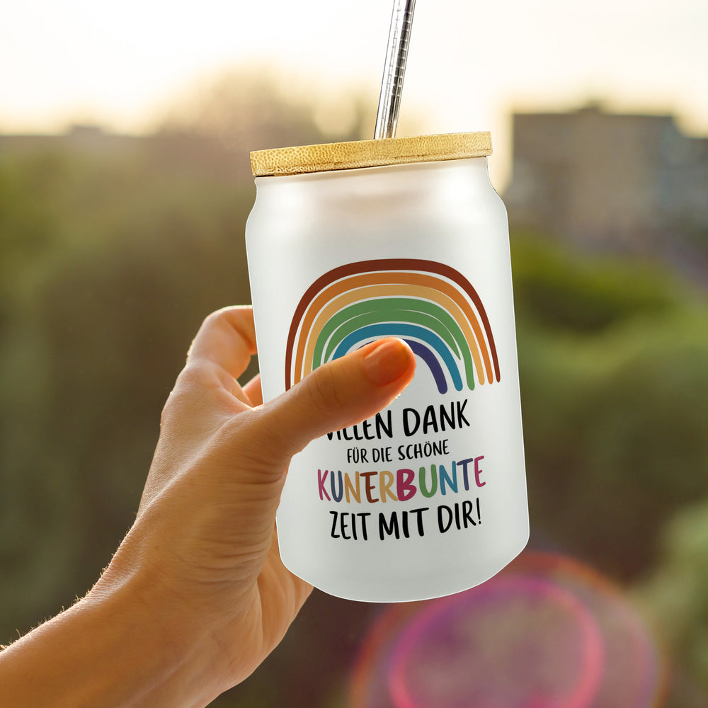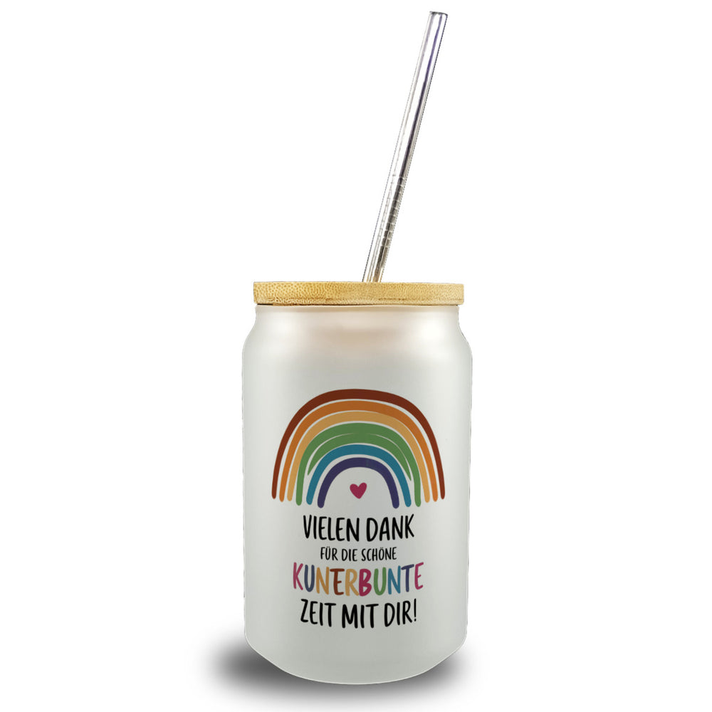 - 1x Vielen Dank für die kunterbunte Zeit Trinkglas mit Bambusdeckel mit Regenbogen mit Bambusdeckel oder Henkel